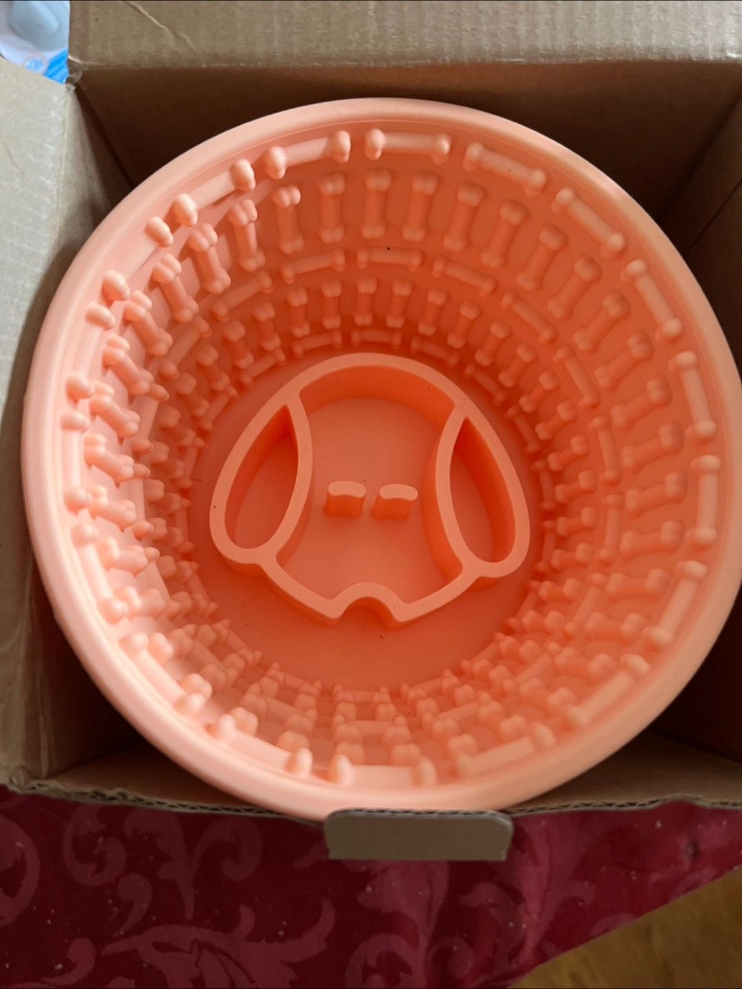 I have a brand new dog slow feeder bowl still in its original box! It's a great way to help your furry friend eat at a healthier pace and prevent bloating. The bowl features a cute dog face design in the centre and bone-shaped obstacles to slow down eating. Perfect for dogs of all sizes!