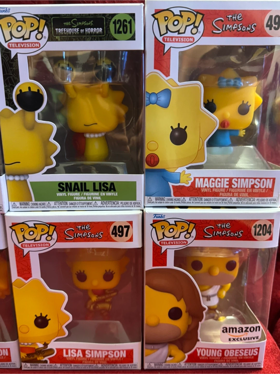 Collectible vinyl figures from The Simpsons television series. These Funko Pop! figures feature characters like Marjora, Homerzilla, Snail Lisa, Maggie Simpson, Skeleton Marge, Lisa Simpson, and Young Obeseus. Made of vinyl.