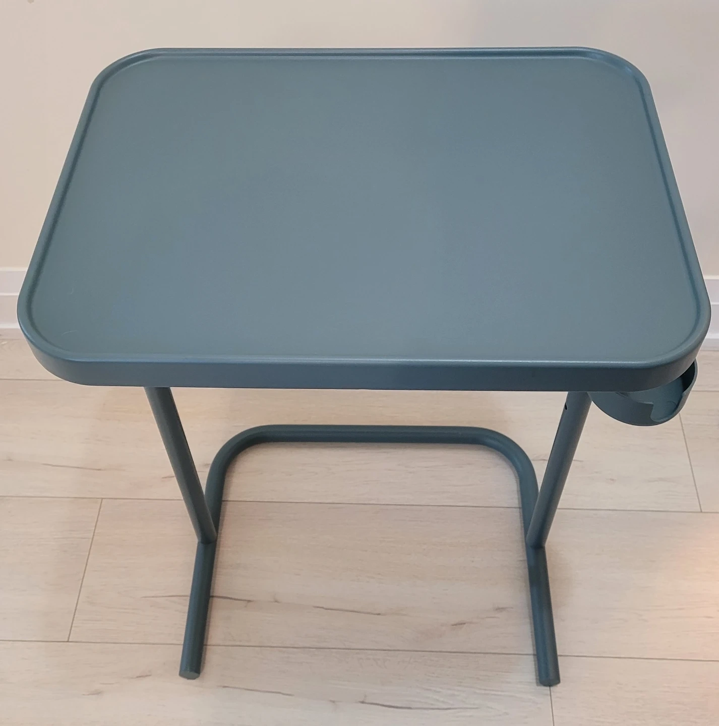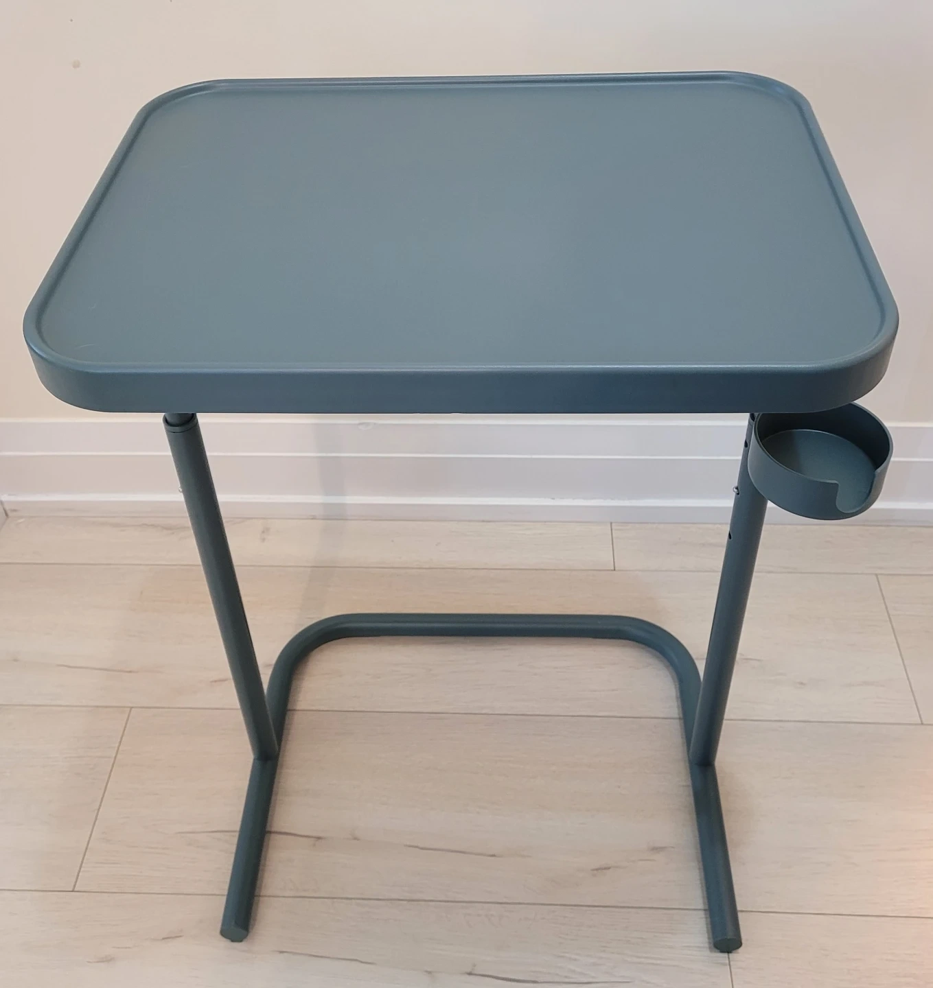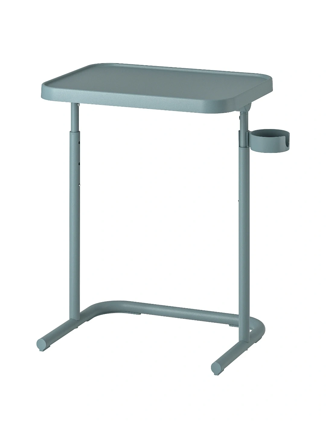 This is a blue side table with a built-in cup holder. It's made of metal and has an adjustable height feature. It's handy for placing drinks or small items while you're relaxing.