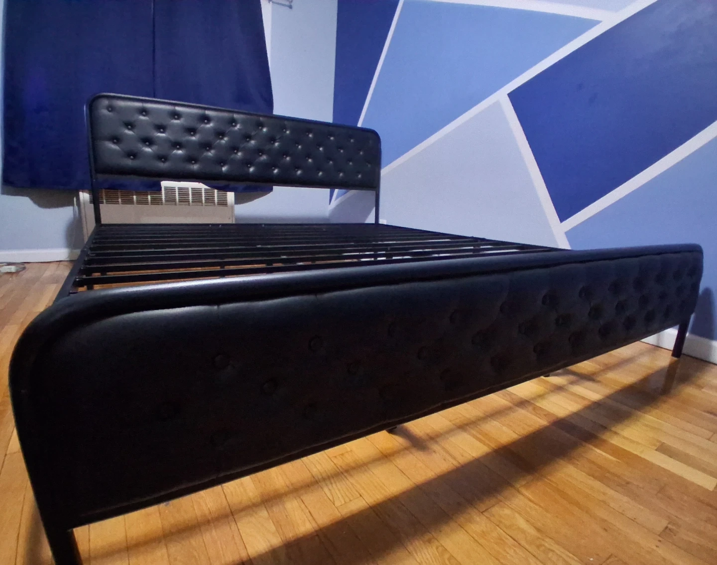 This frame combines industrial strength with a luxury aesthetic, featuring a beautiful Button Faux Leather Headboard and matching footboard. It’s in great shape and ready for a new home.