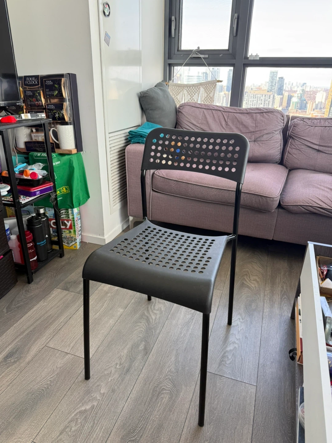 This is a black IKEA chair with a perforated seat and back. It's made of plastic and metal. It's a versatile chair that can be used in many settings.