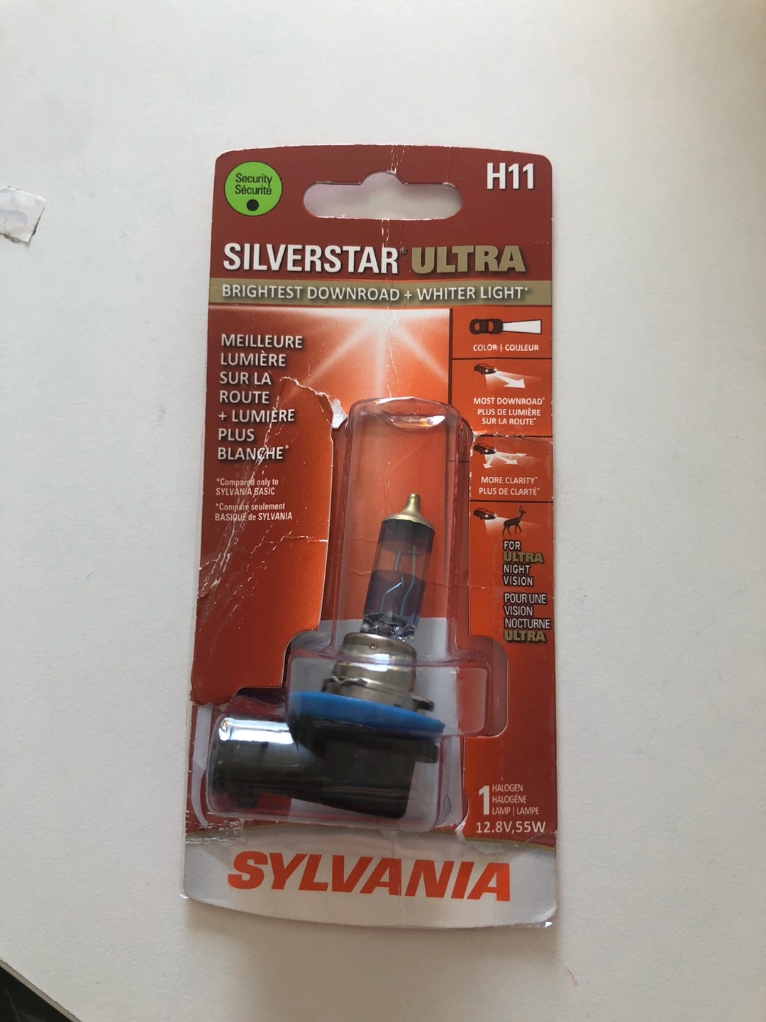 Selling a Sylvania Silverstar Ultra H11 halogen headlight bulb - Provides brighter downroad and whiter light - Designed for ultra night vision - 12.8V, 55W Asked Canadian Tire staff for a white light and was given with this. After installed, the difference between two headlight is too obvious. Couldn’t return this as package is open.