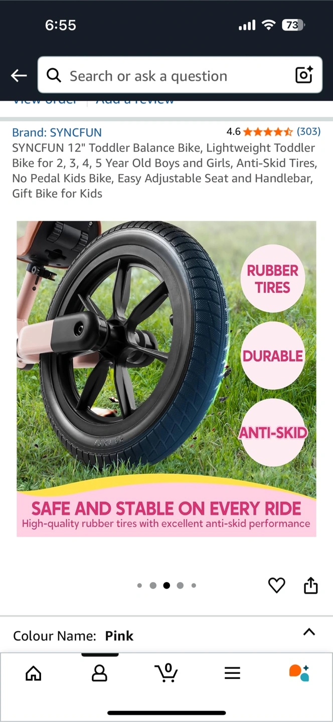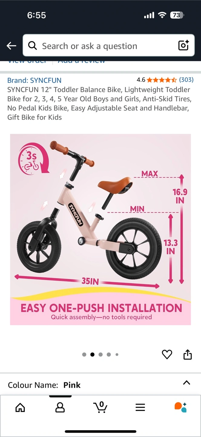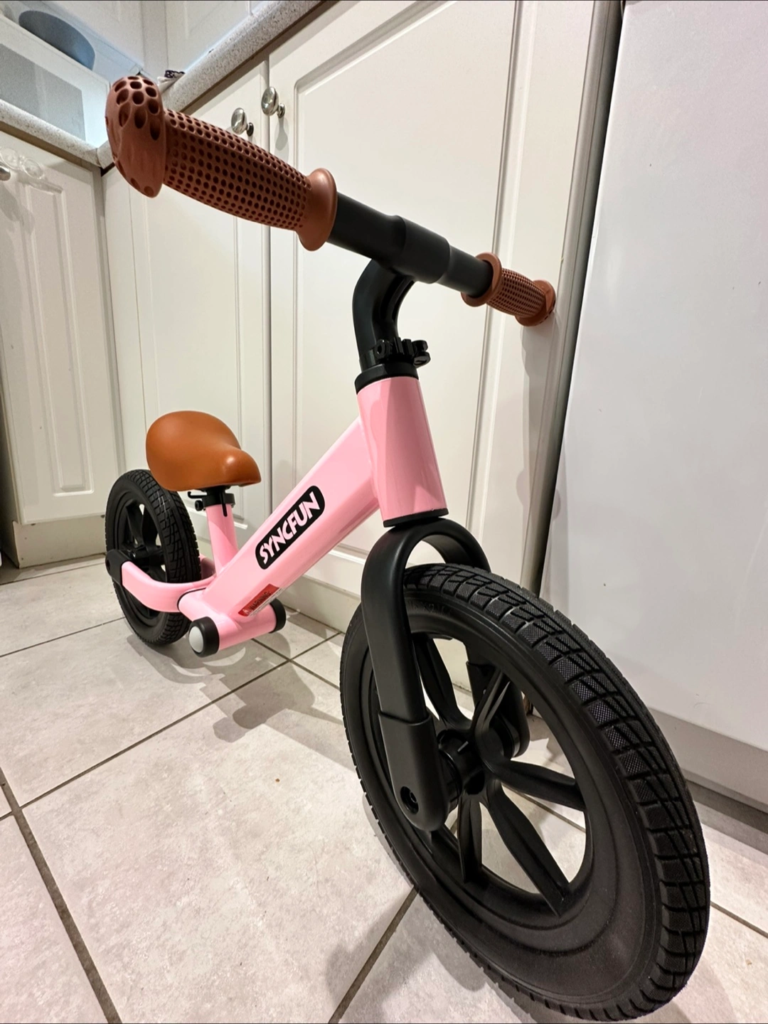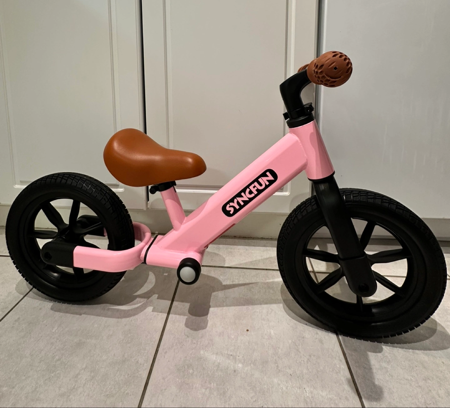 Selling a gently used SYNCFUN 12" toddler balance bike in pink. It's perfect for kids aged 2-5 to learn balance bike and coordination. The bike features: - Lightweight design - Adjustable seat and handlebar - Anti-skid tires for safety It’s NEW! Bought in June, 2025.