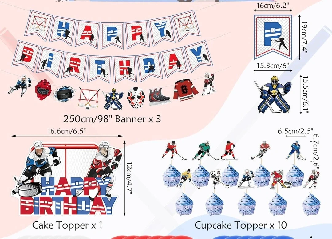 This hockey-themed party decoration set includes three 98-inch banners, one cake topper, and ten cupcake toppers. It's perfect for a hockey fan's birthday celebration. The set features playful hockey player graphics and vibrant colours.