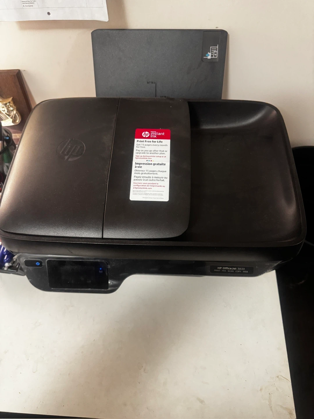 HP OfficeJet 3833 all-in-one printer. It's black and features print, fax, scan, and copy functions. Great condition barely used. Yes it works!! Just barely used. No need for it.