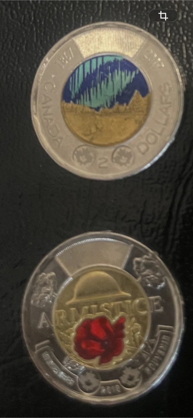 Collection of Canadian $2 coins (toonies) featuring different designs. Includes coins from 2017 and 2018 with various commemorative themes. These coins are great for collectors or anyone interested in Canadian currency.