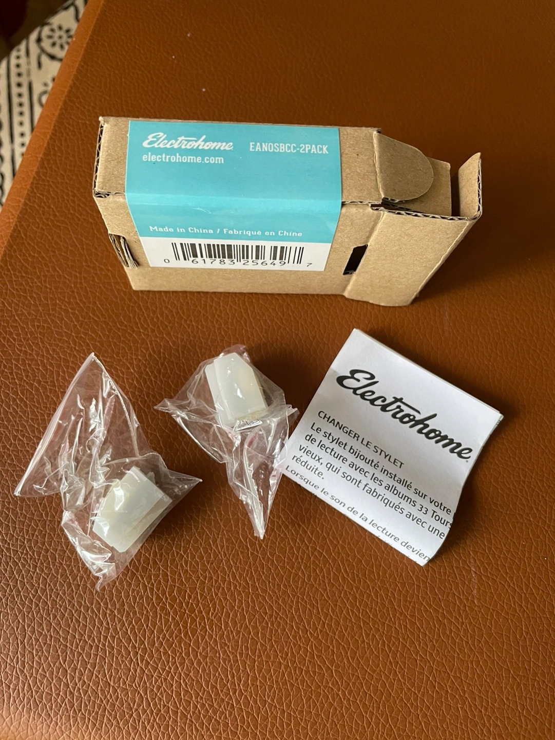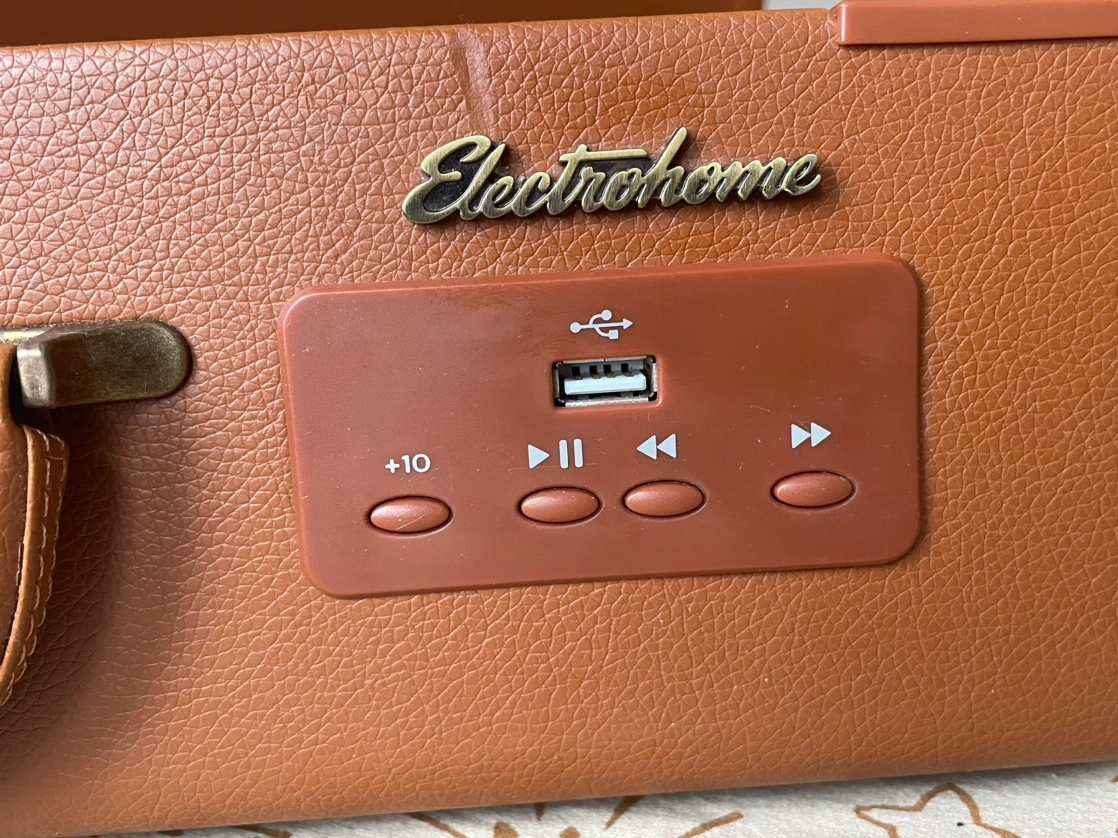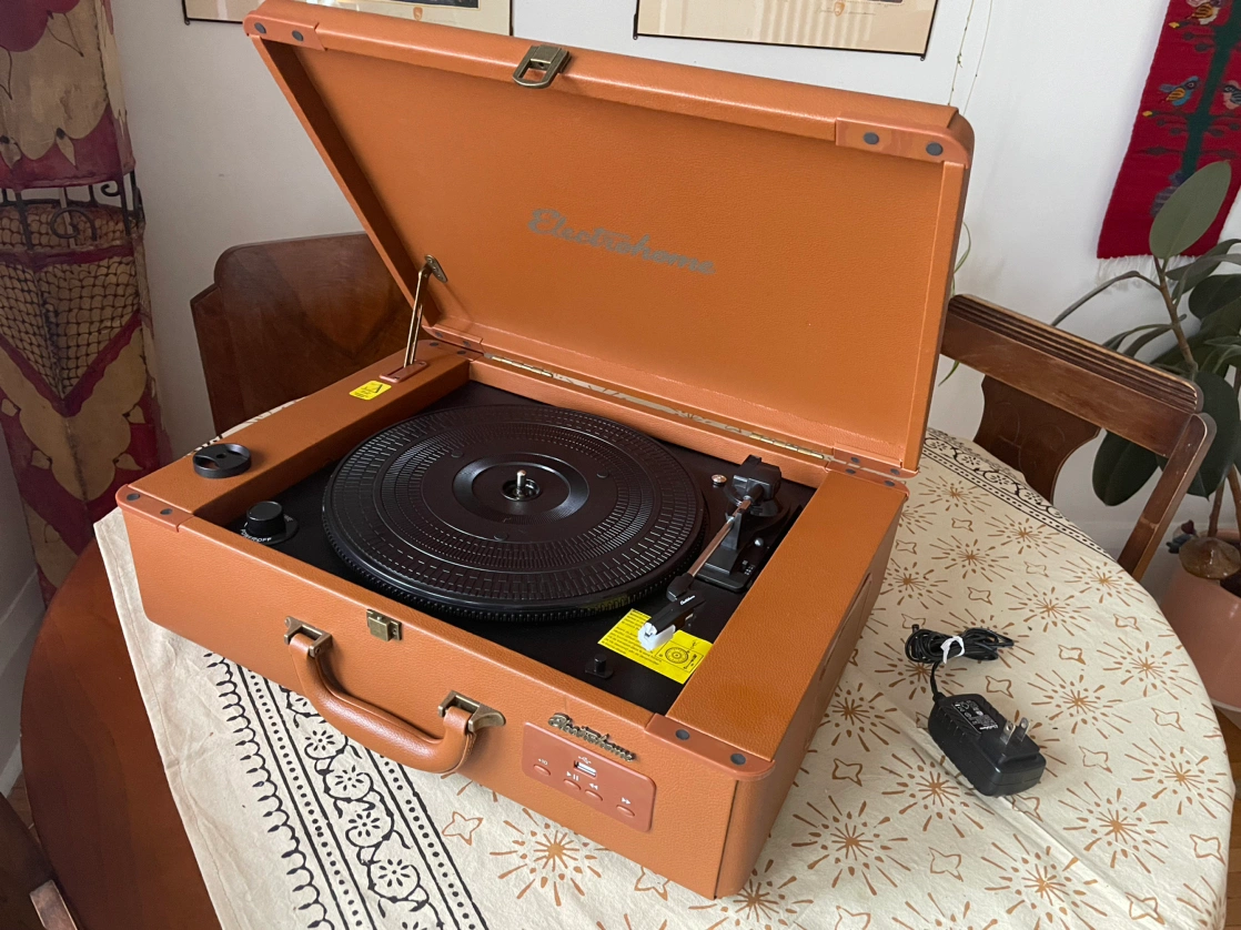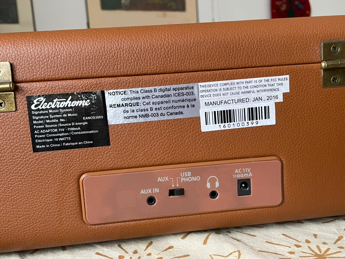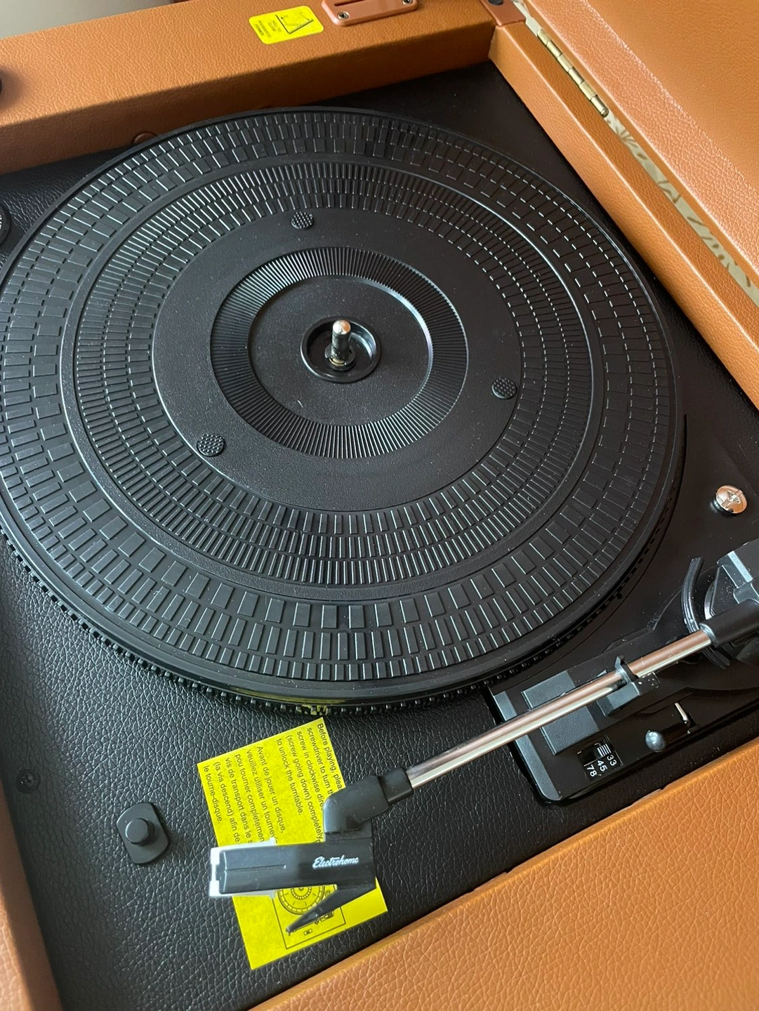 Hello! Looking to get rid of my saddle brown (faux leather) Electrohome portable record player. The speakers don’t work, but you can hook it up to a speaker and it works fine!