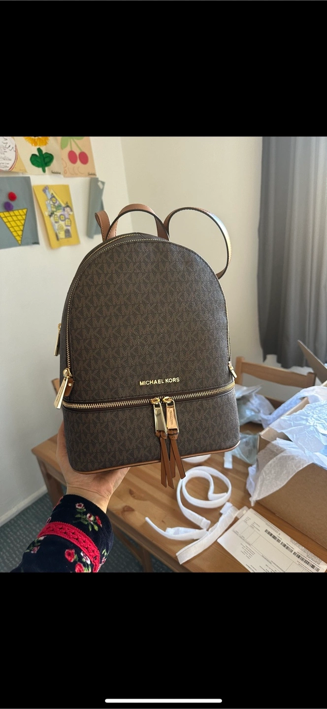 MK brand new backpack. Brown and tan signature print. Gold hardware. Two zipper compartments. Adjustable straps. Bought for 258+tax