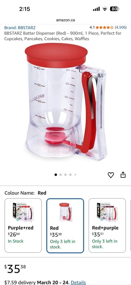 Clear batter dispenser is super handy for baking. Has red lid and handle. Measuring marks for cups and milliliters. Great for pancakes, waffles, or cupcakes. It is 185mm tall and 110mm wide. Condition: Brand New. MRSP: $35. $25 OBO. Pickup is Oshawa or Scarborough. If ad is up, item is available.