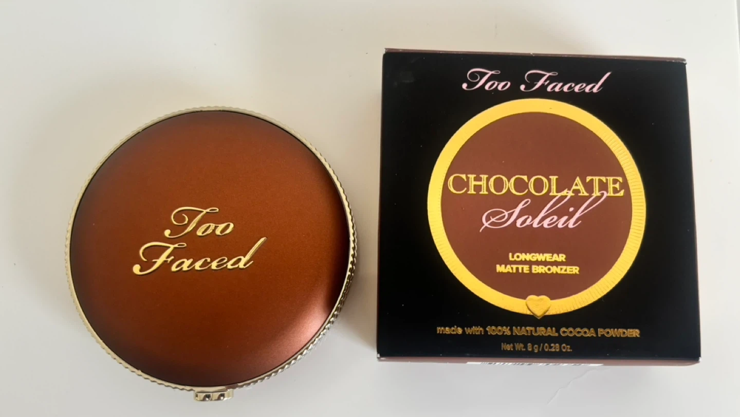 Too Faced Chocolate Soleil Longwear Matte Bronzer. Made with 100% Natural Cocoa Powder. Net Wt. 8 g / 0.28 Oz. Bronzer comes in a compact with a mirror.