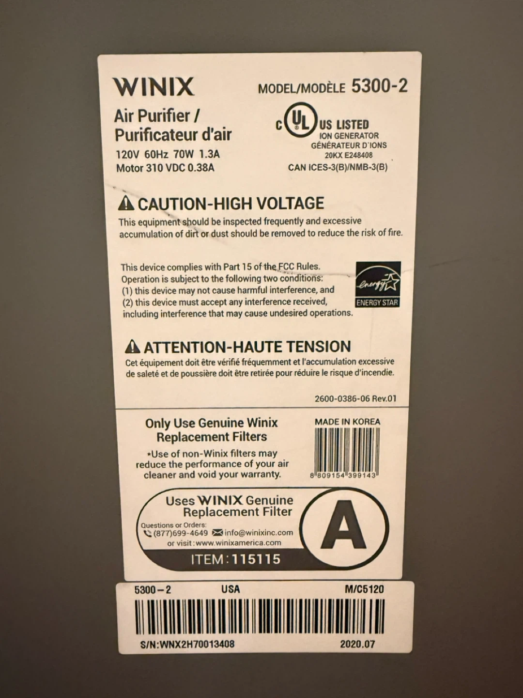 Winix 5300-2 Air Purifier- Use True HEPA Filter