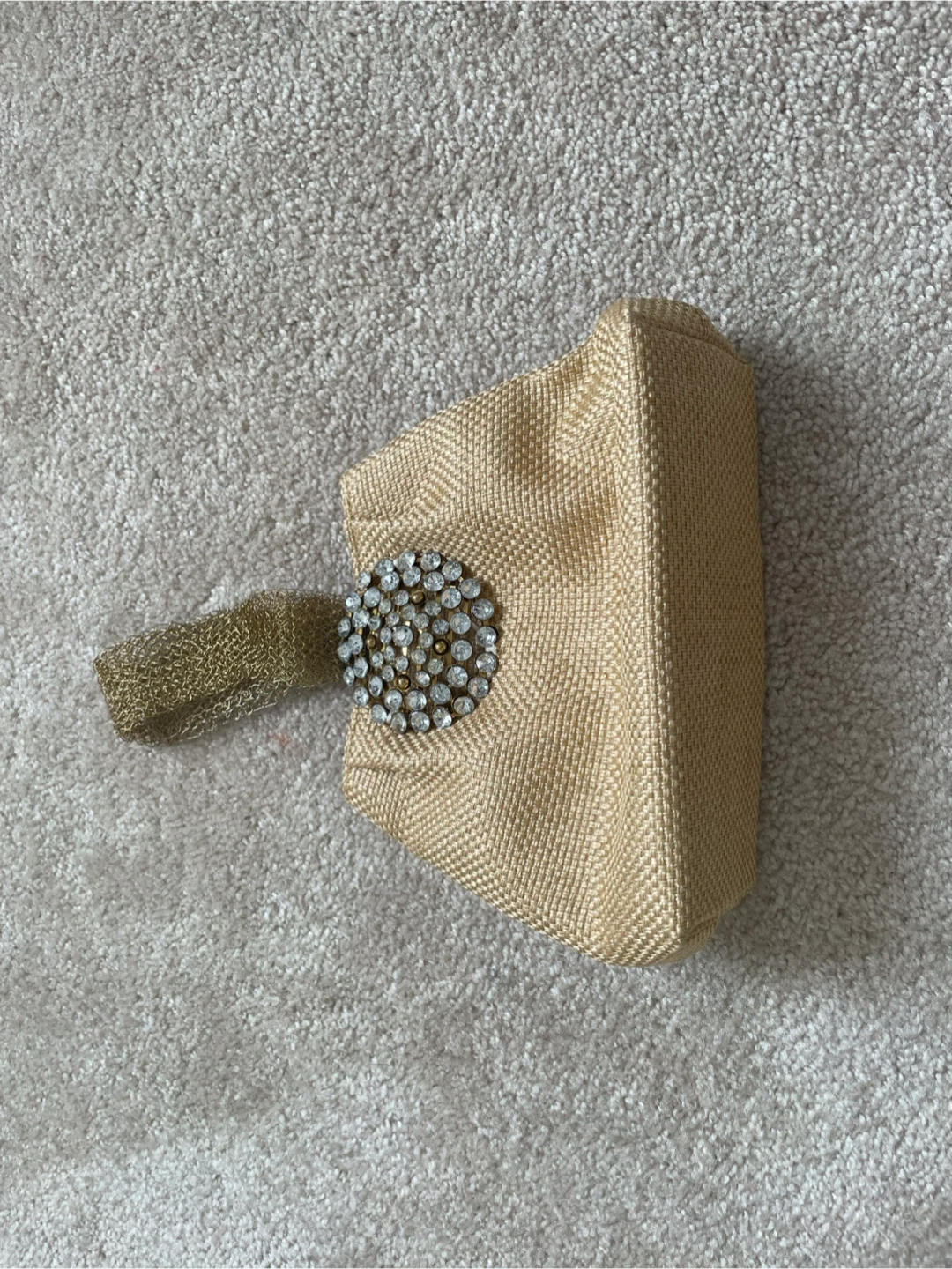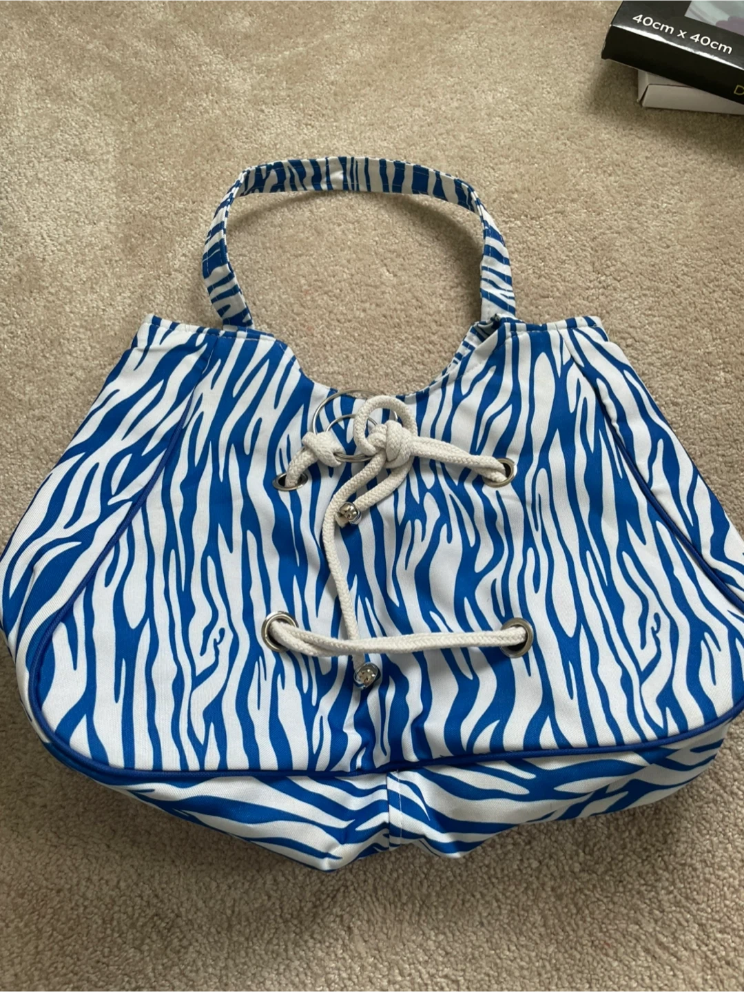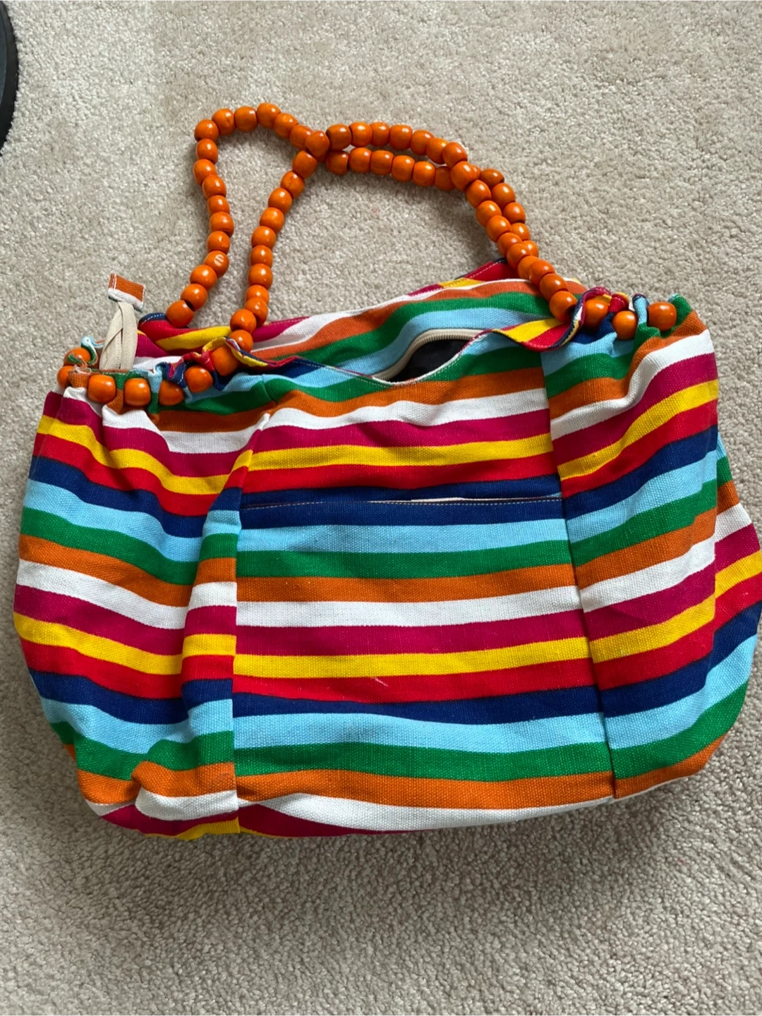 Bundle includes a colourful striped tote bag with wooden bead handles, a beige clutch with a jewelled embellishment, and a blue and white zebra print drawstring bag. Also includes a black hanging toiletry bag. Great for travel or everyday use!