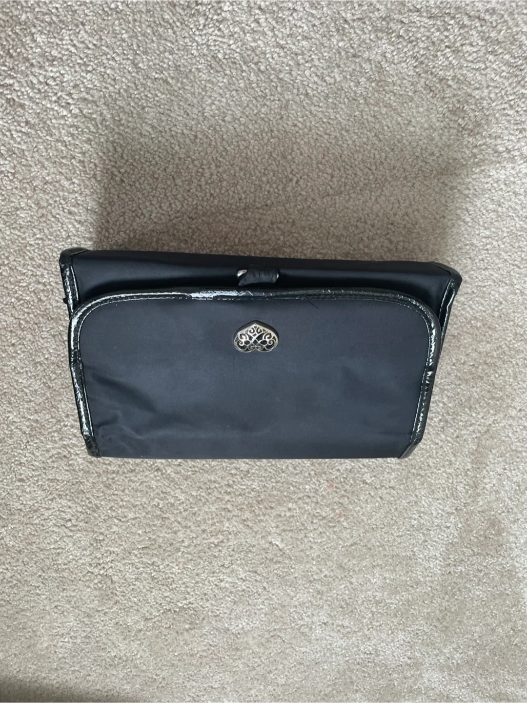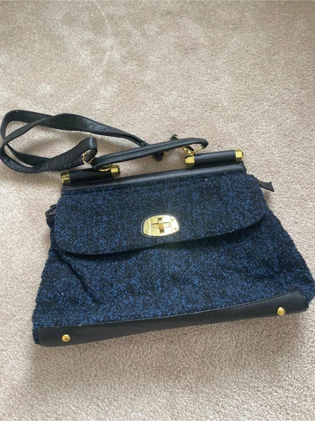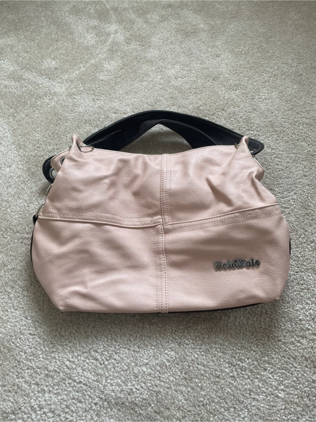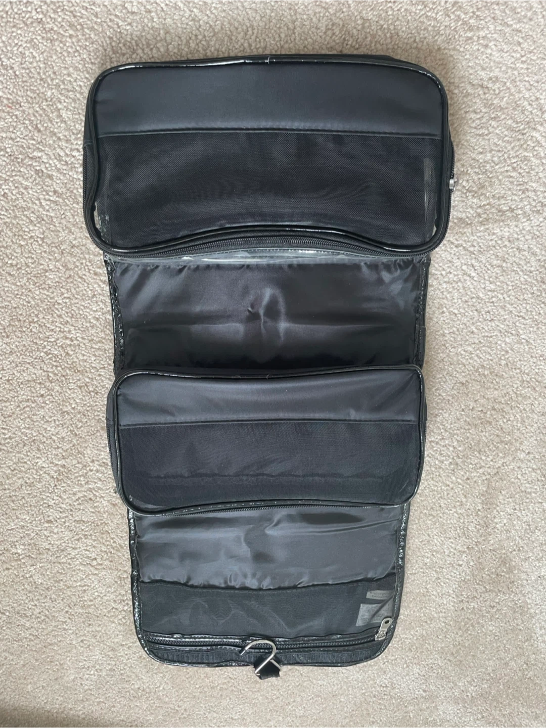 Bundle includes a colourful striped tote bag with wooden bead handles, a beige clutch with a jewelled embellishment, and a blue and white zebra print drawstring bag. Also includes a black hanging toiletry bag. Great for travel or everyday use!