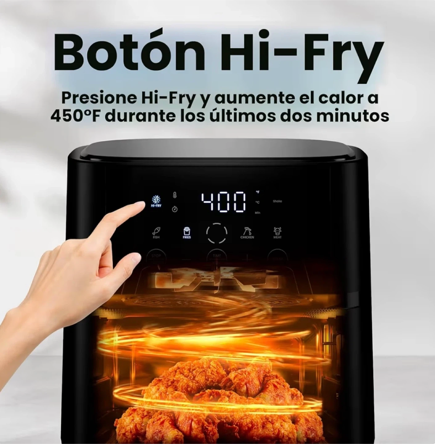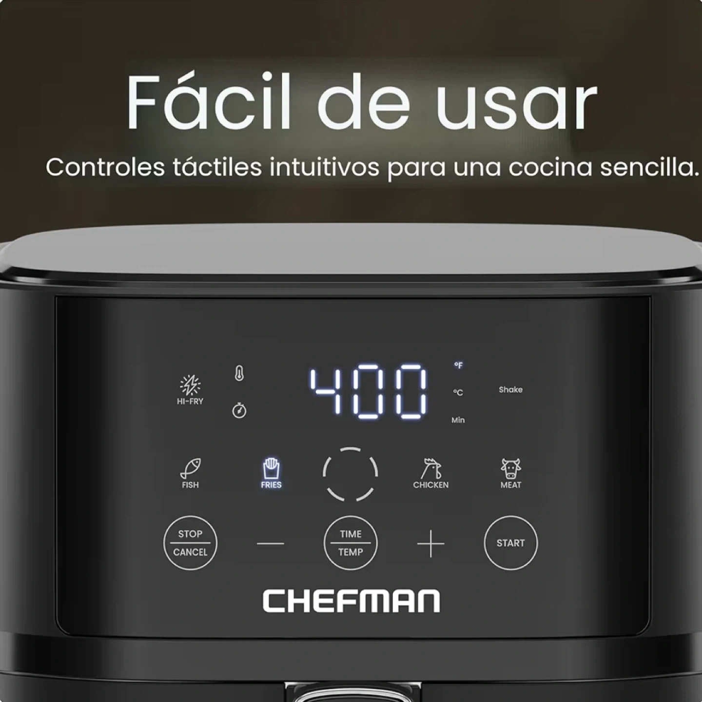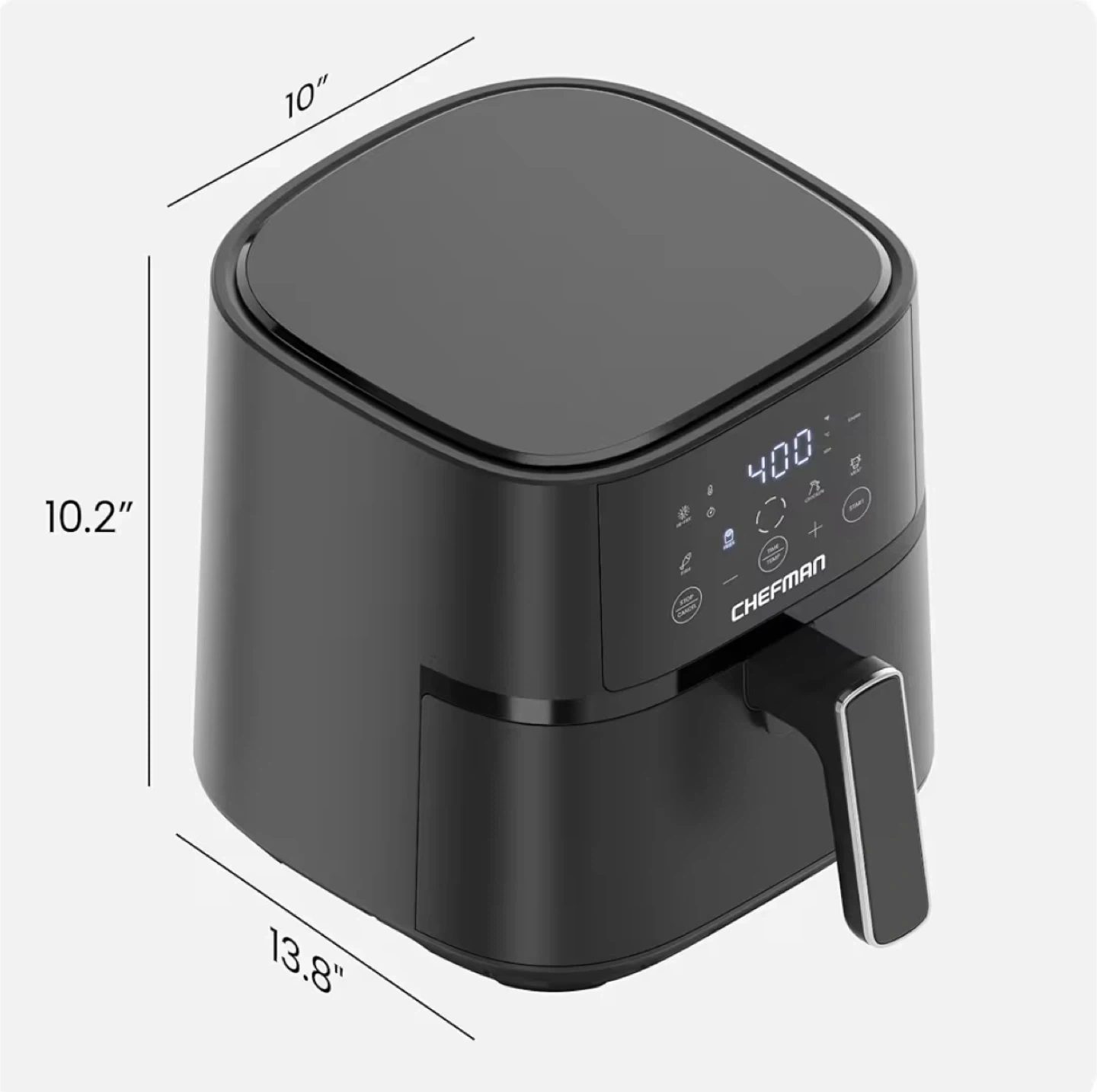 This Chefman air fryer has a 4 Qt. total capacity and a max temperature of 450°F. It uses 85% less oil for healthier cooking. Its digital display includes presets for fish, fries, chicken, and meat.