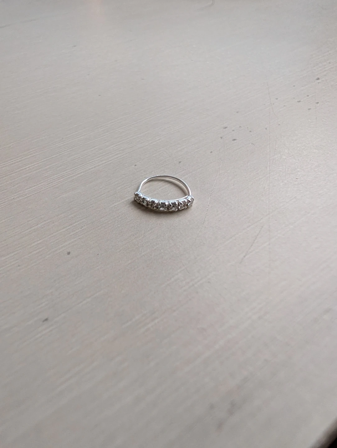This ring has a silver coloured band with small clear rhinestones set in a row. It's a delicate piece perfect for adding a bit of sparkle. This would be a nice gift for someone.