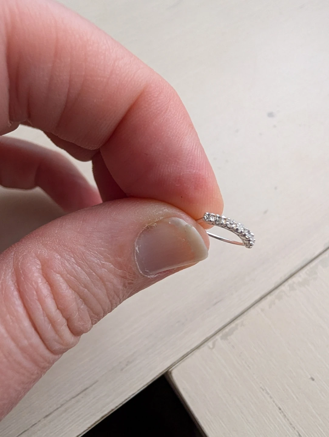 This ring has a silver coloured band with small clear rhinestones set in a row. It's a delicate piece perfect for adding a bit of sparkle. This would be a nice gift for someone.