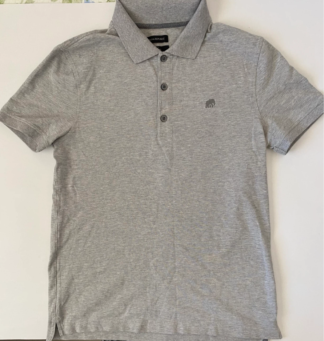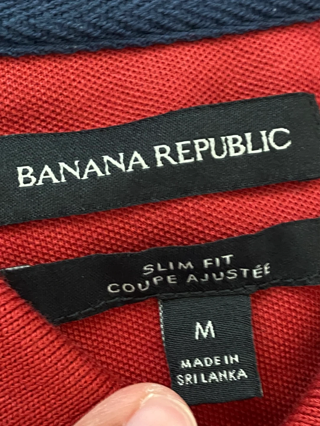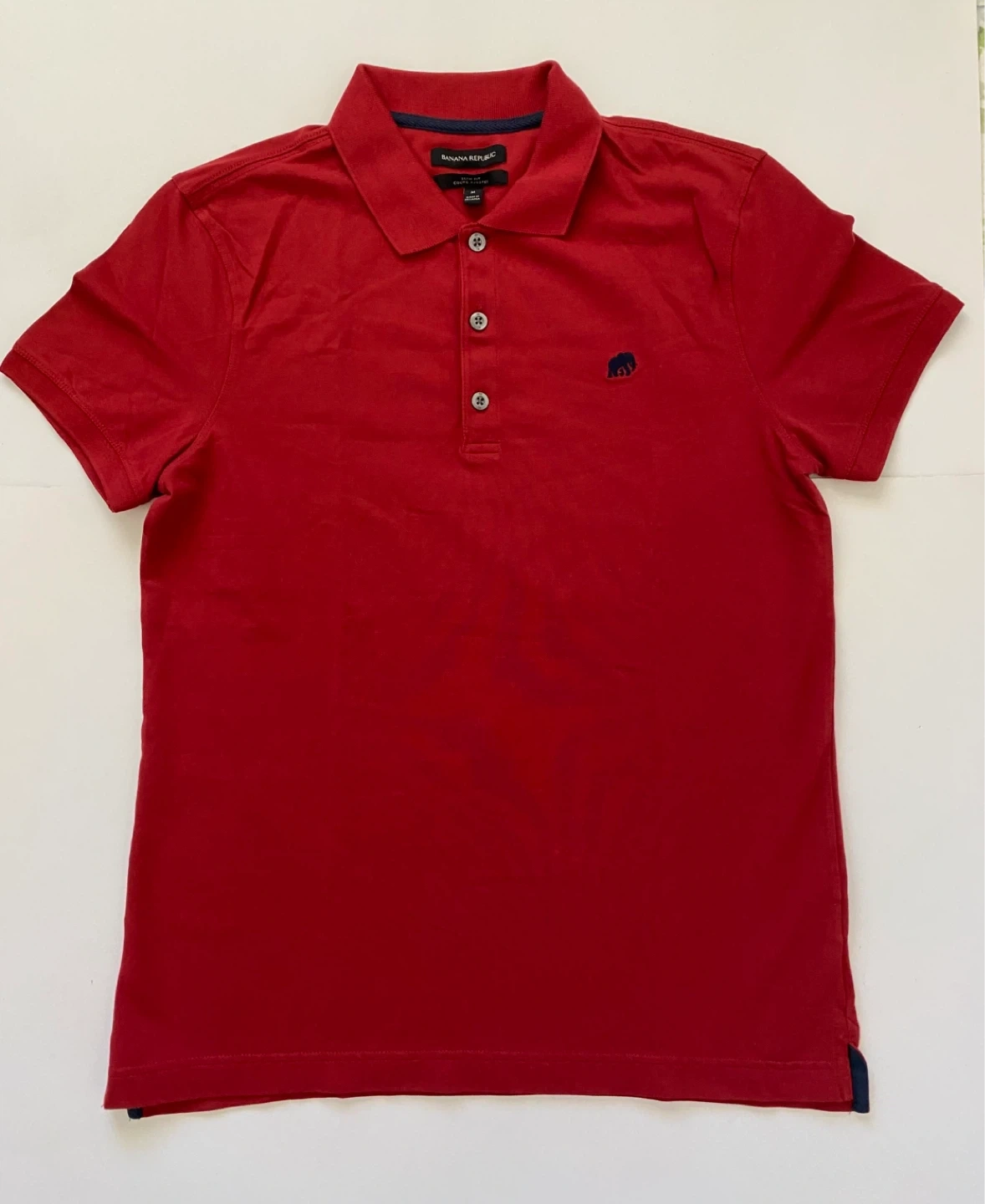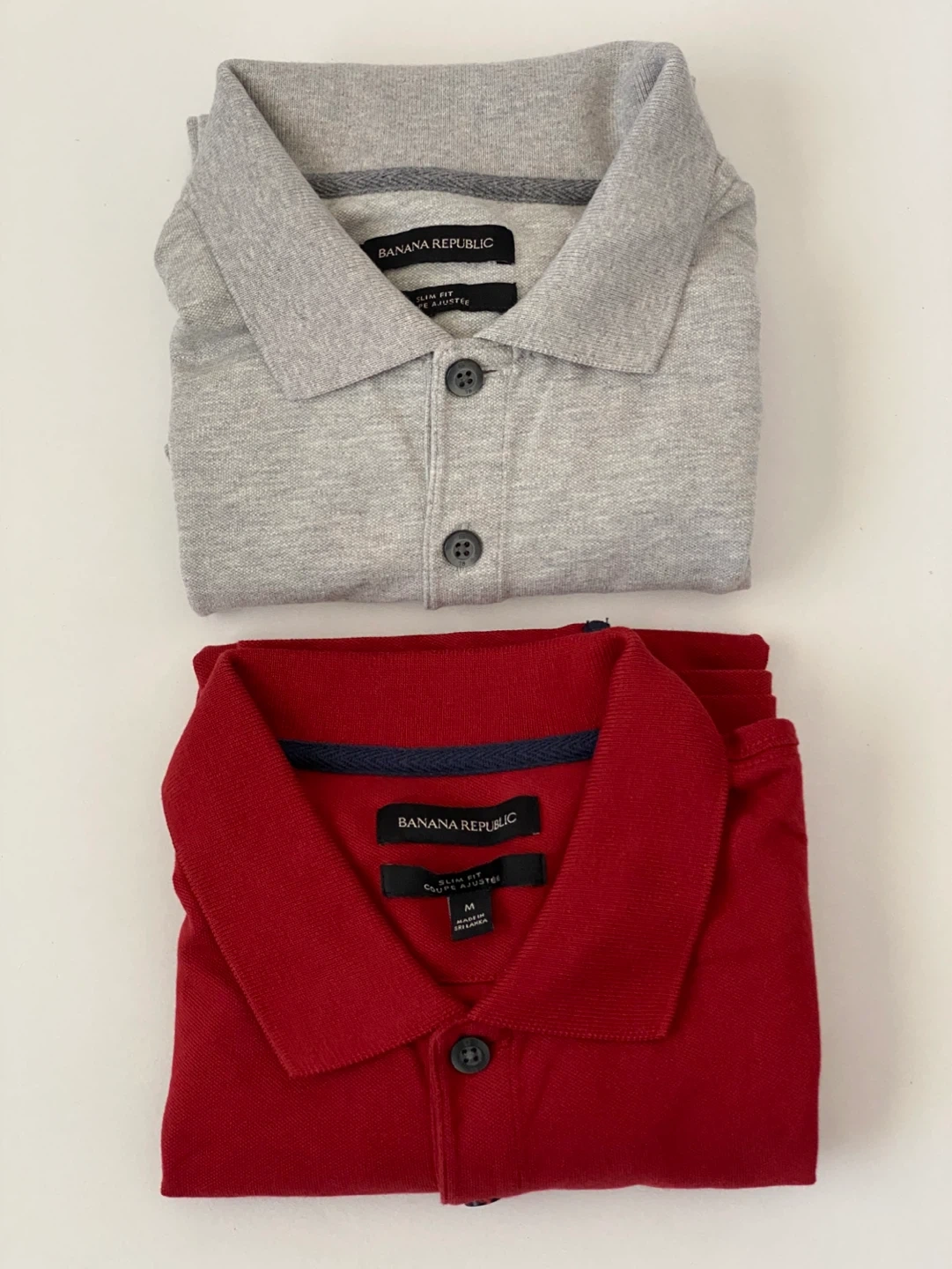 Two Banana Republic polo shirts included, one red and one grey. Both are a slim fit style and size medium. They're made with a comfortable cotton blend. Gray shirt has had the size tag cut off.
