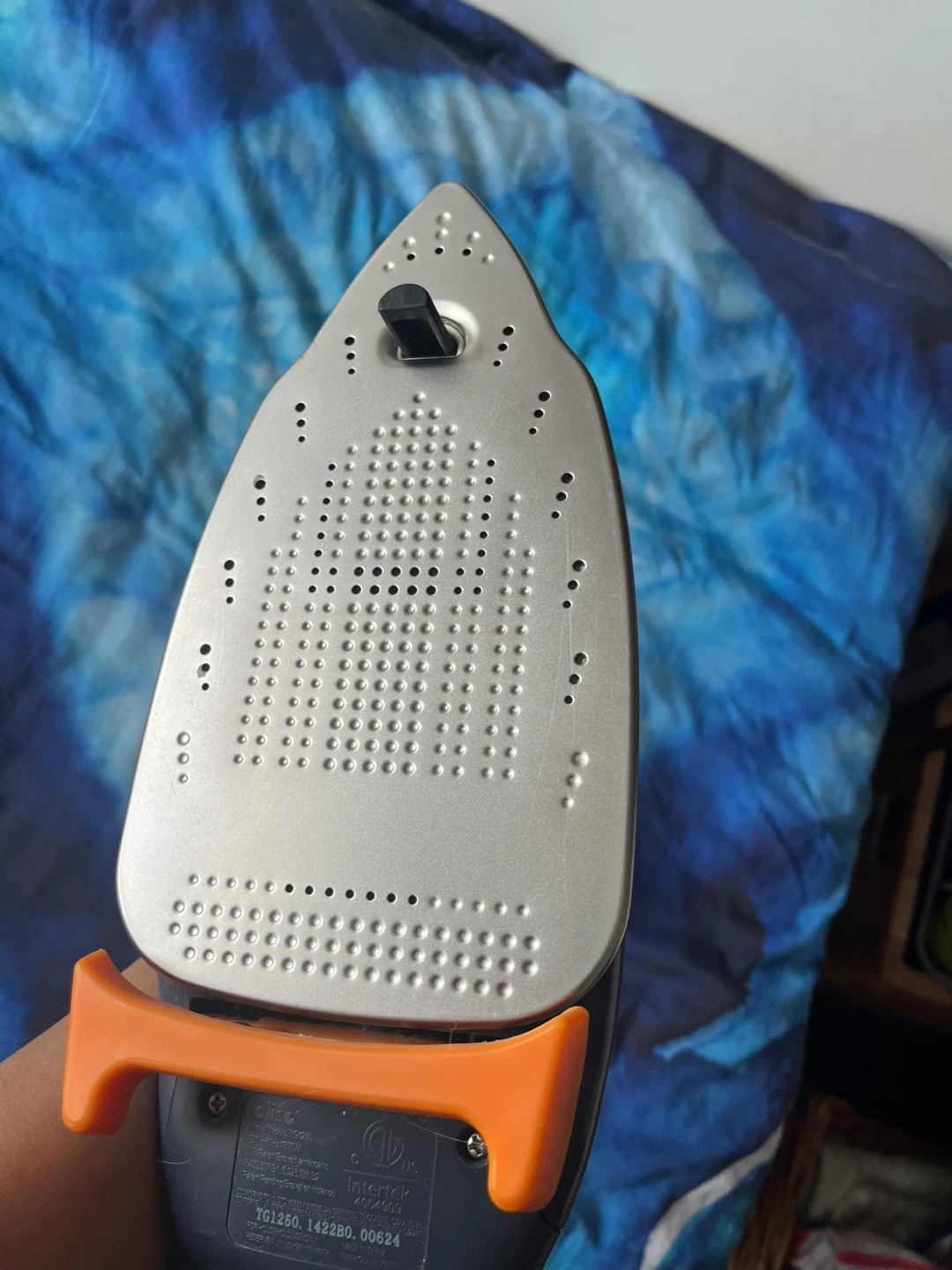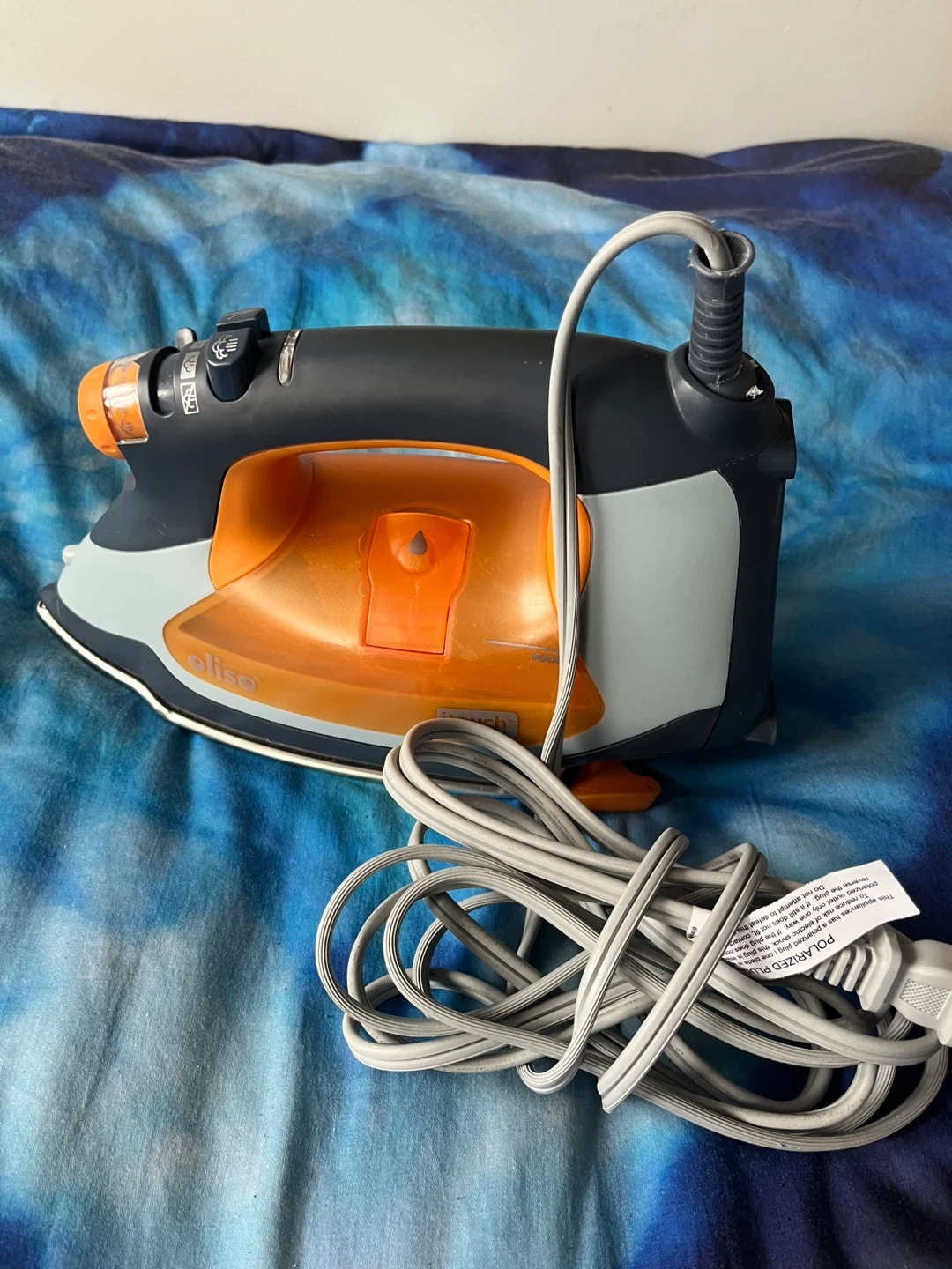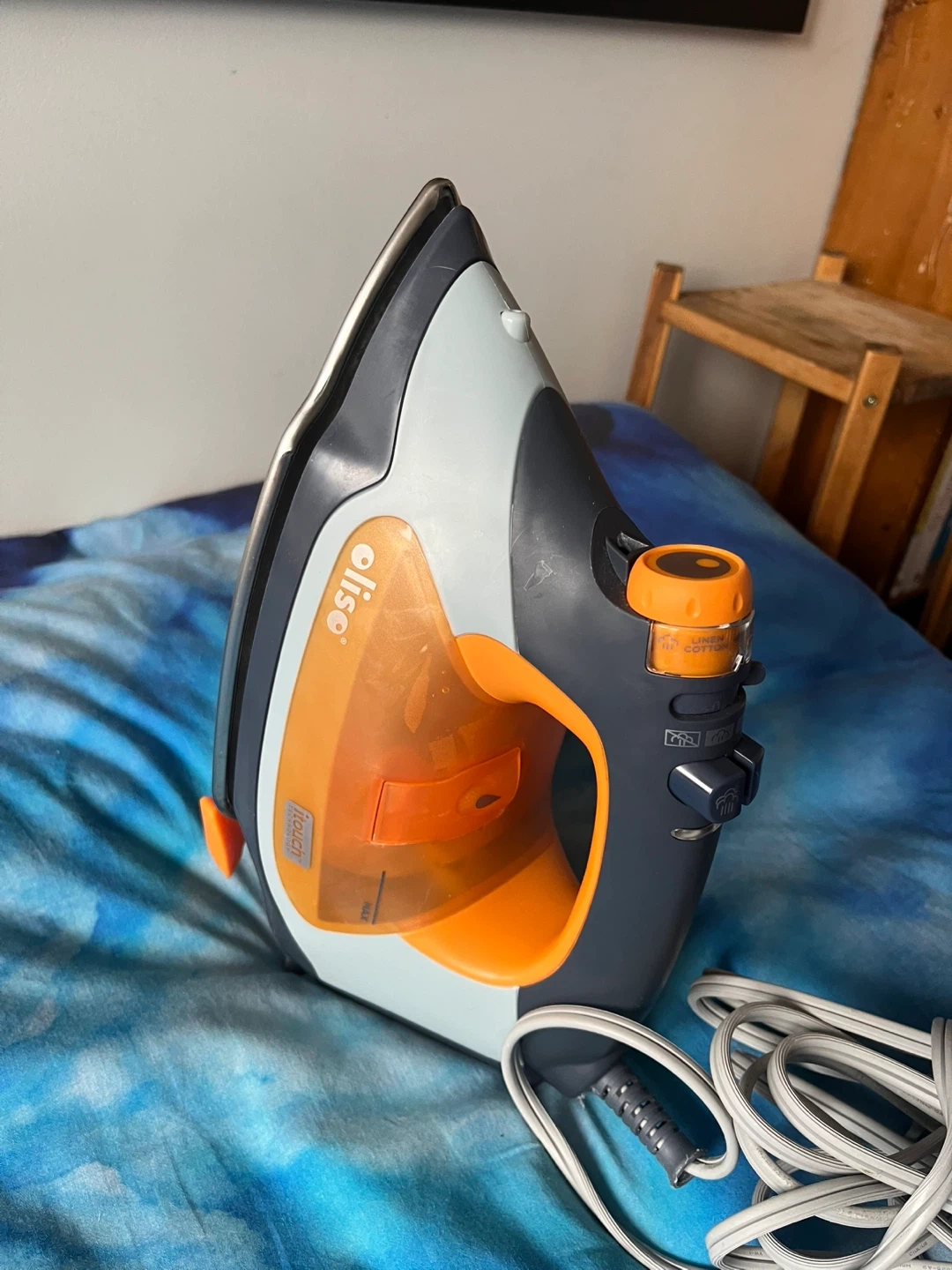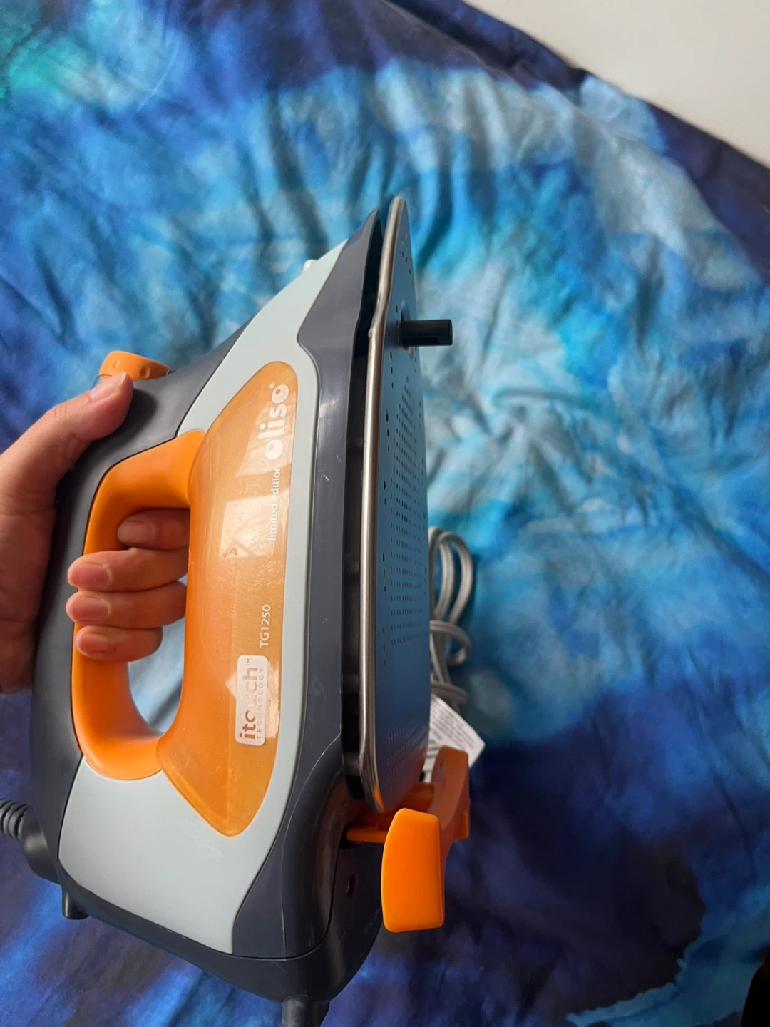 Olie TG1250 steam iron with iTouch technology. It lifts its self when you remove your hand, automatically protecting clothes from burning . It has a water tank and a very long cord for power. This iron is great for smoothing out wrinkles on your clothes.