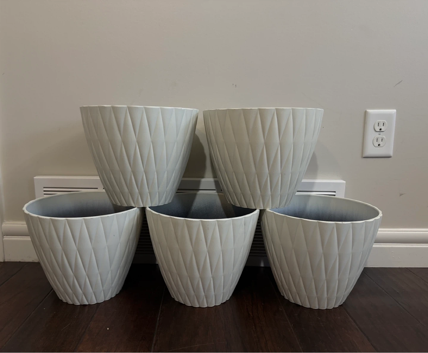 Five white planters with a diamond pattern design. These pots have a textured exterior and a smooth interior. They're suitable for indoor or outdoor plants.