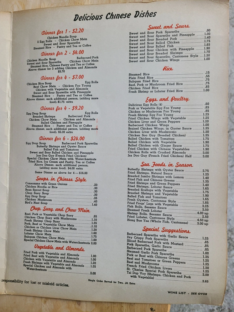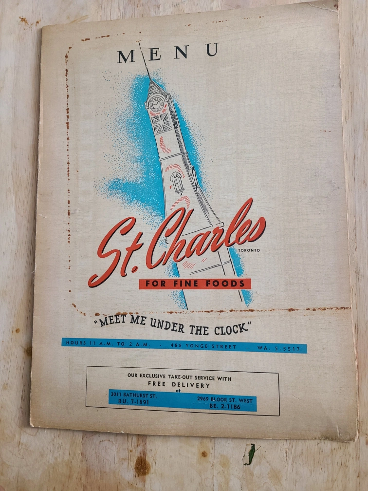 This is a vintage menu for St. Charles Restaurant in Toronto, Ontario. The menu lists a variety of Chinese dishes including soups, chow mein, chop suey, and rice dishes. It also includes a wine list. It was a very popular gay bar. This piece has historical value.