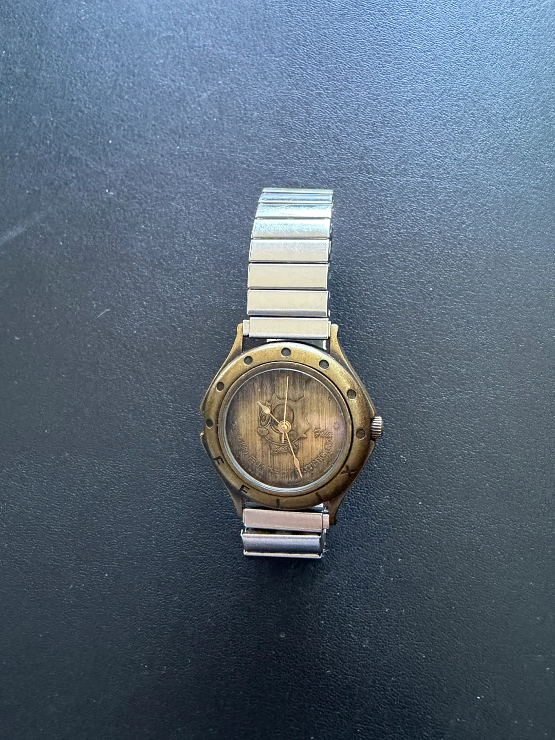 This is a Felix the Cat watch with a metal band. It features a vintage-style face. It's a cool accessory for any fan!