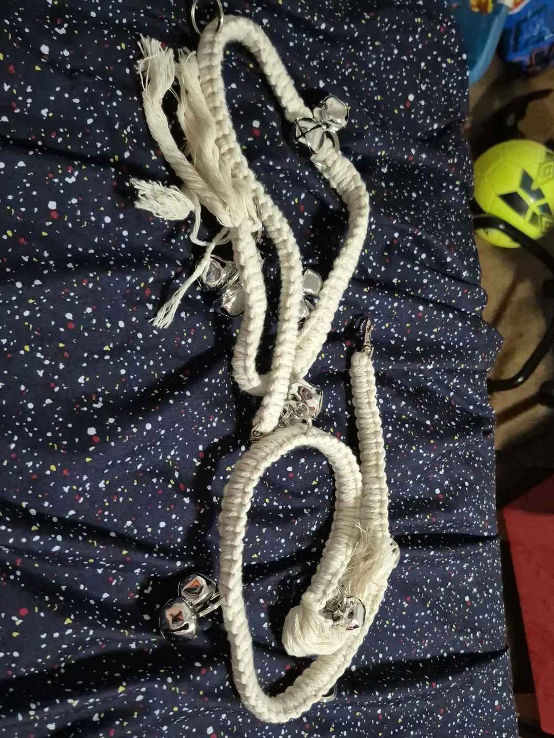 This is a braided white rope toy designed for pets. It's adorned with multiple silver bells that jingle when moved. The rope has frayed ends for added texture. It's a fun toy that can engage pets with sound and texture.