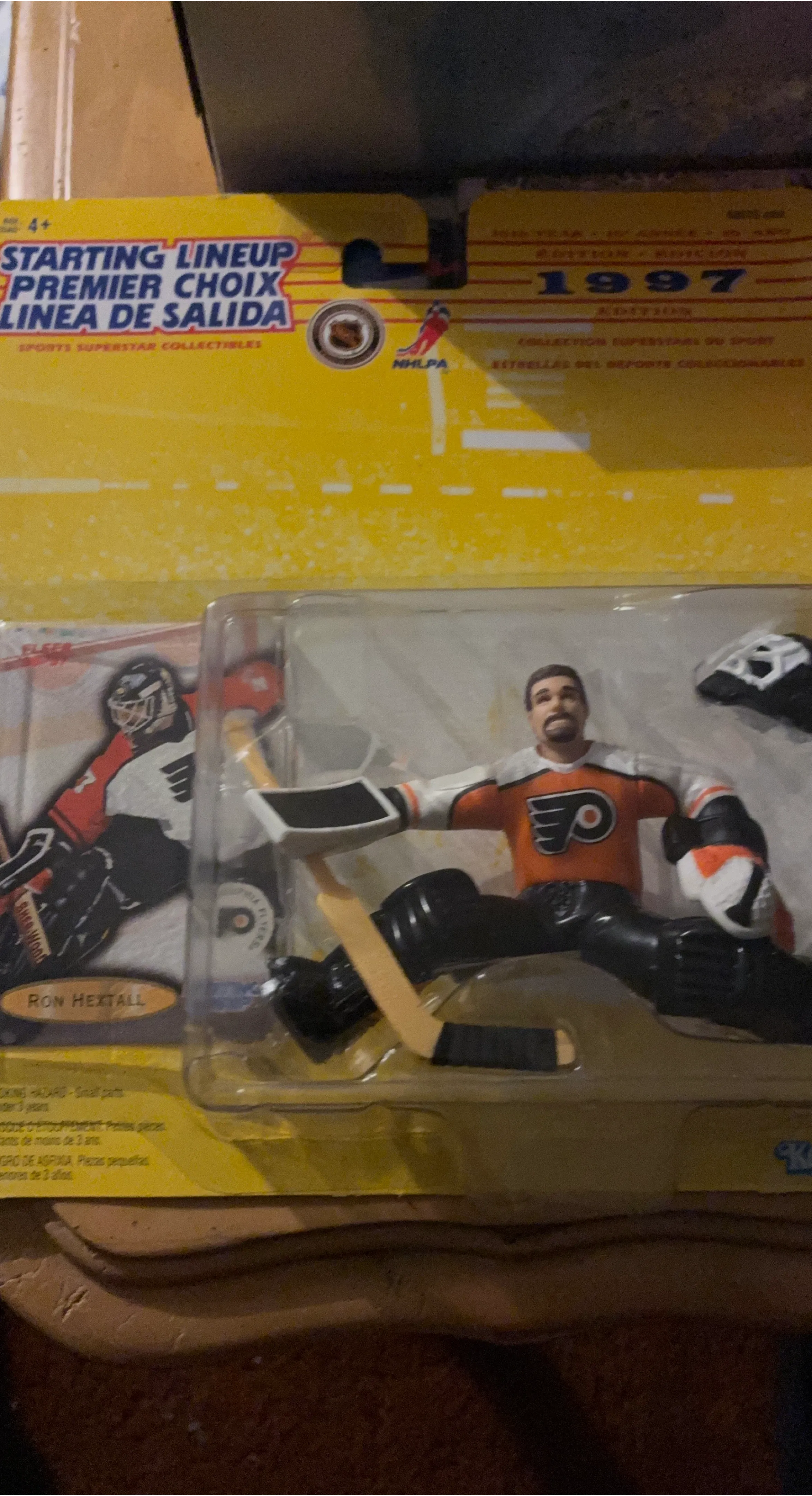 This is a Starting Lineup Premier Choix hockey figure of Ron Hextall from 1997. It's a Sports Superstar Collectibles item. The figure comes in its original packaging and includes accessories.
