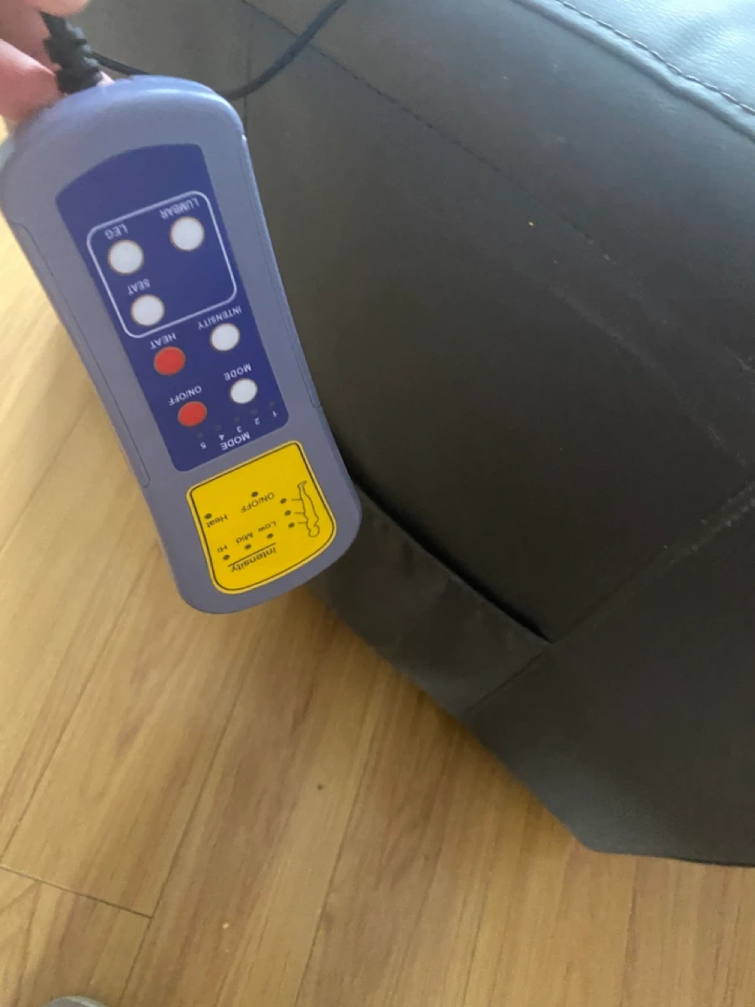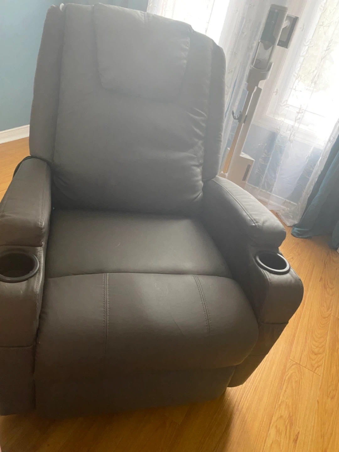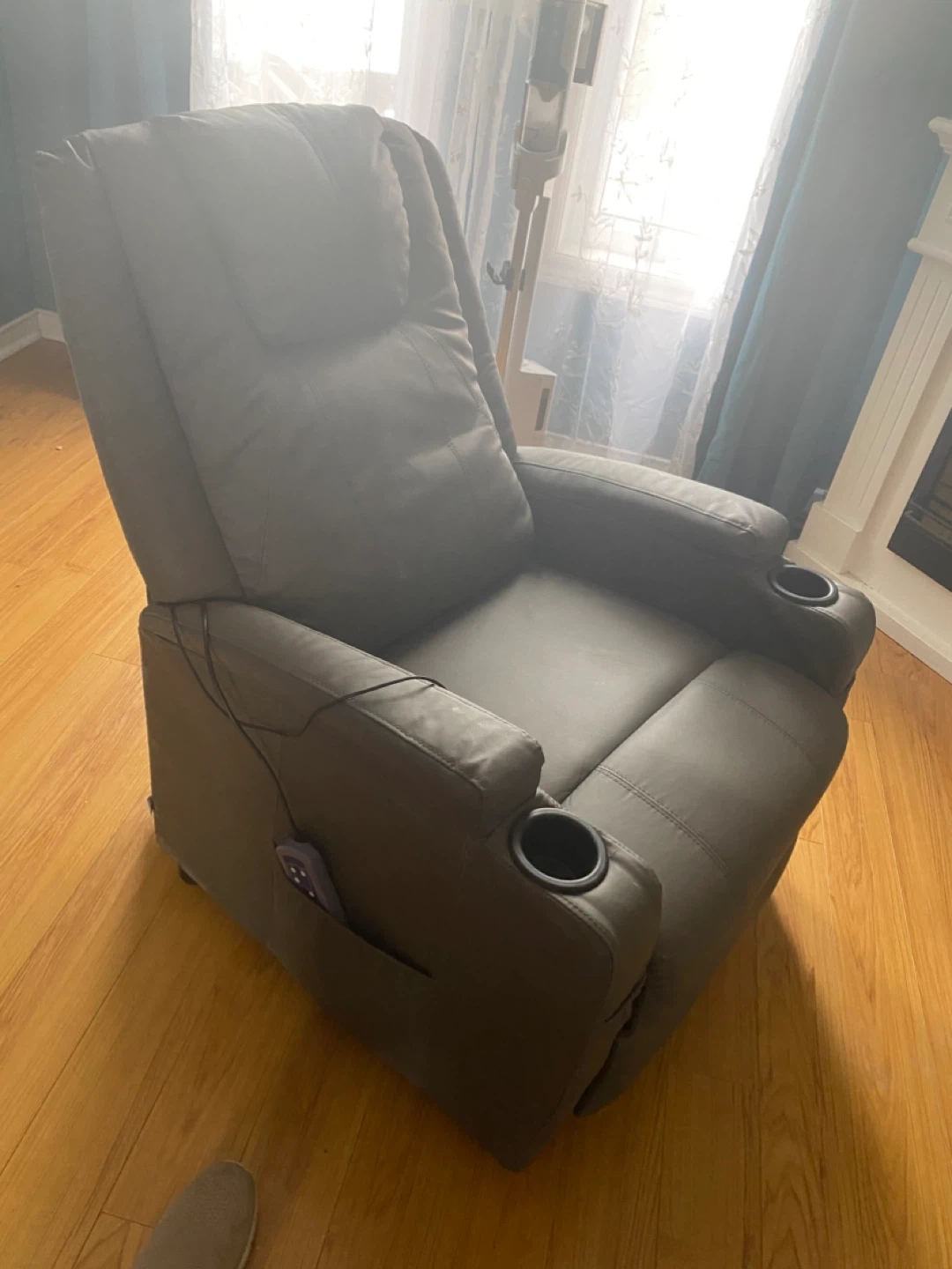 This recliner offers a comfortable seating experience with built-in massage functions for your legs, seat, and lumbar. It features integrated cup holders for convenience. The chair comes with a remote control to adjust intensity, mode, and heat settings.