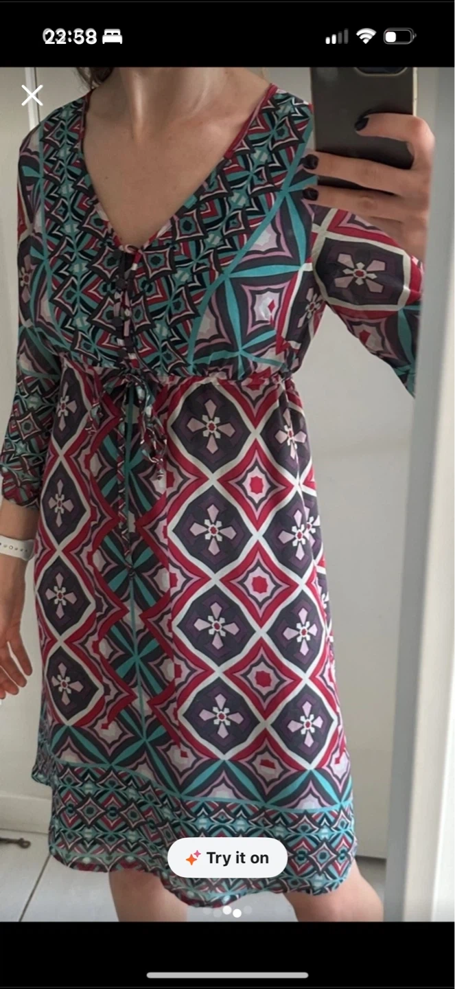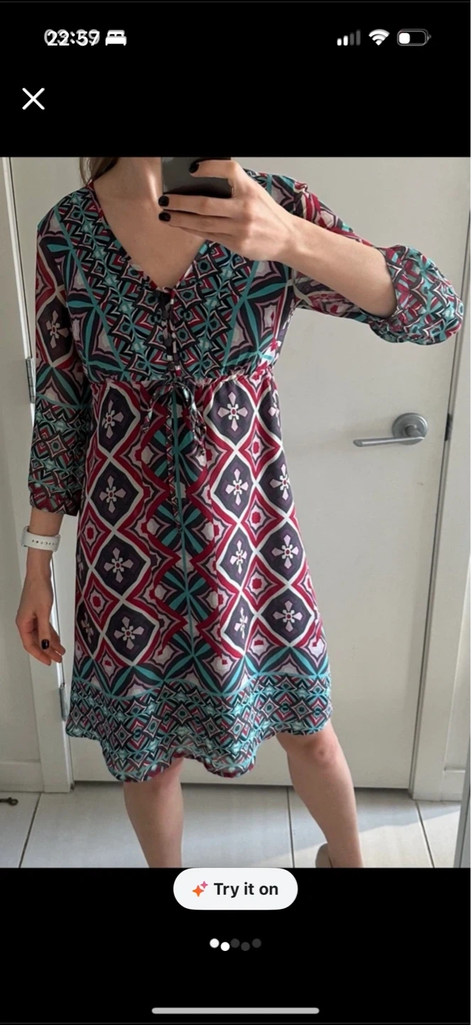 Buy & SellBohemian DressBohemian Dress$10Lightweight v-neck dress with a tie waist and a colourful geometric print. Size sSizeSWHERE TO MEET1250 Hornby StView MapSELLERverifiedVictoriaDowntown66786 reviews0 chats·0 favorites·3 viewsSEND CHAT TO SELLERHi Victoria! I’m interested in your listing.Hi Victoria! I’m interested in your listing.Get the Karrot app to chatSign In to chat