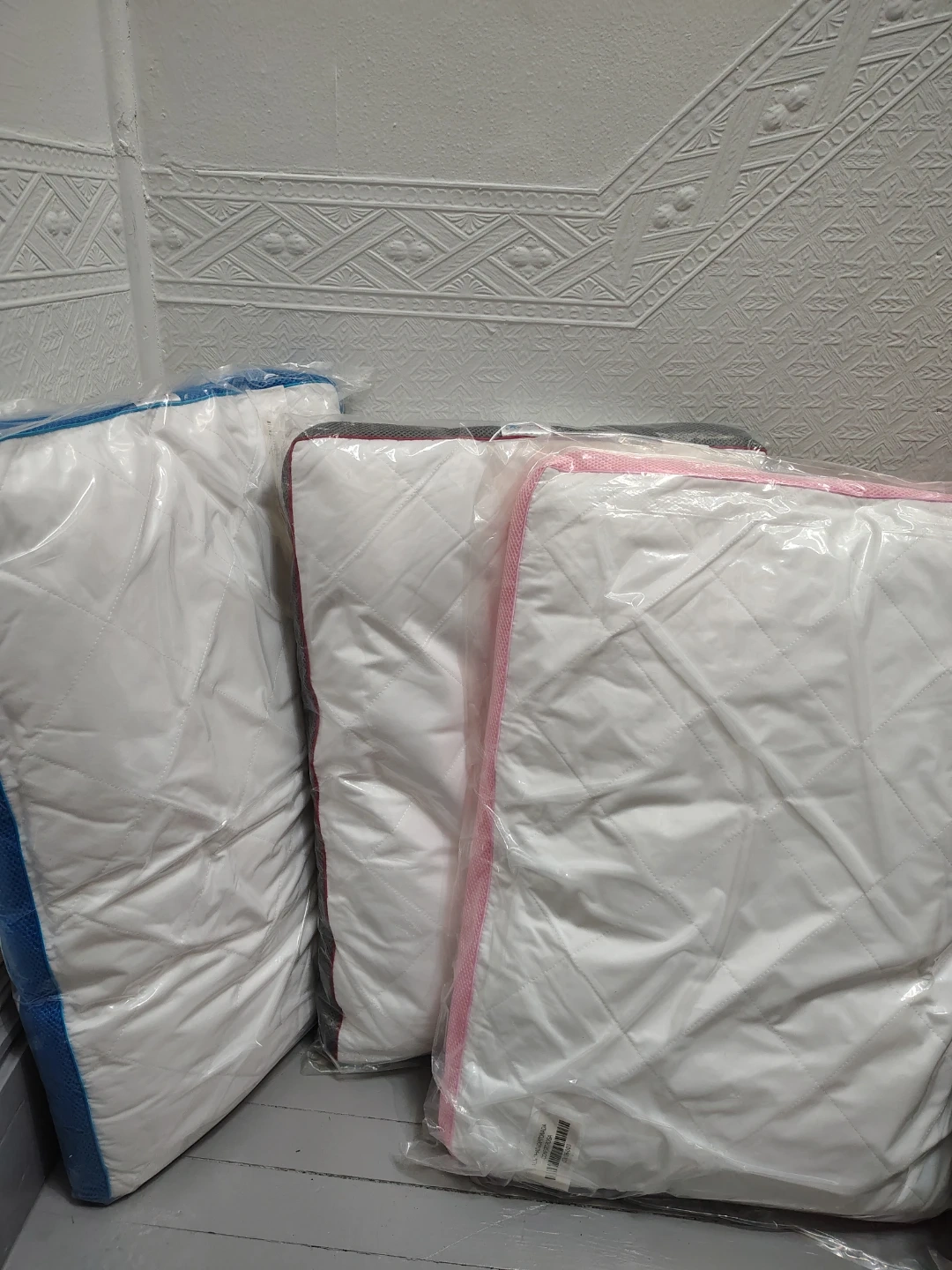 Selling a set of Comfort pillows still in their original packaging! These pillows are white with colored trim. They're brand new and ready to bring you a comfortable night's sleep size 19 inch high 26w