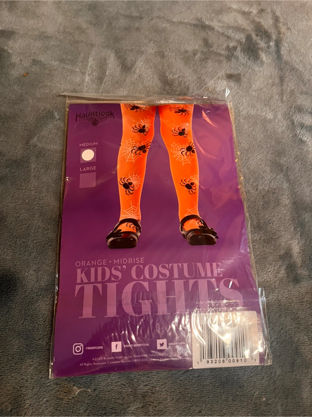 New Hauntlook kids' costume tights in size medium! These are orange with a spider and web design, perfect for Halloween or dress-up. They come in the original packaging.