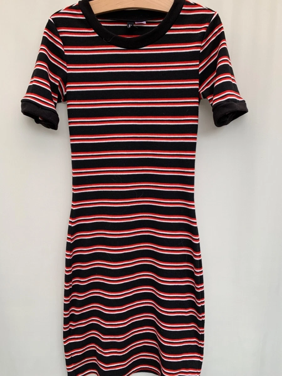 Cute H&M mini dress with a striped pattern! It's black with red and white stripes. The dress is a size XS (0) and has short sleeves with rolled cuffs. Perfect for a casual day out!