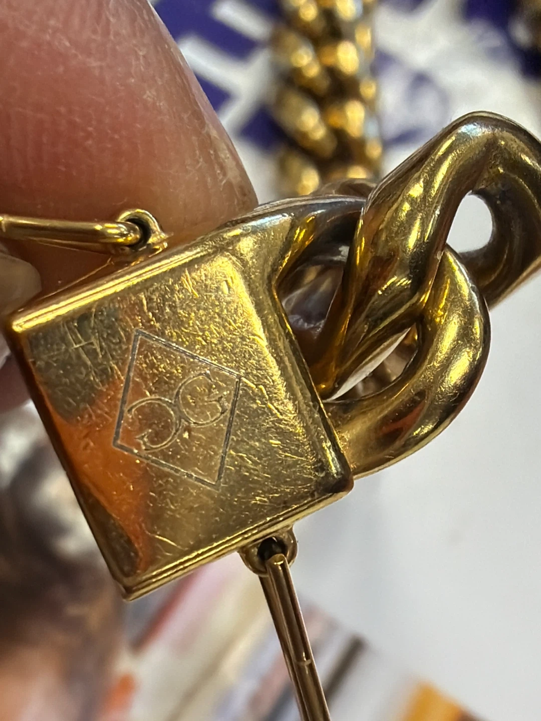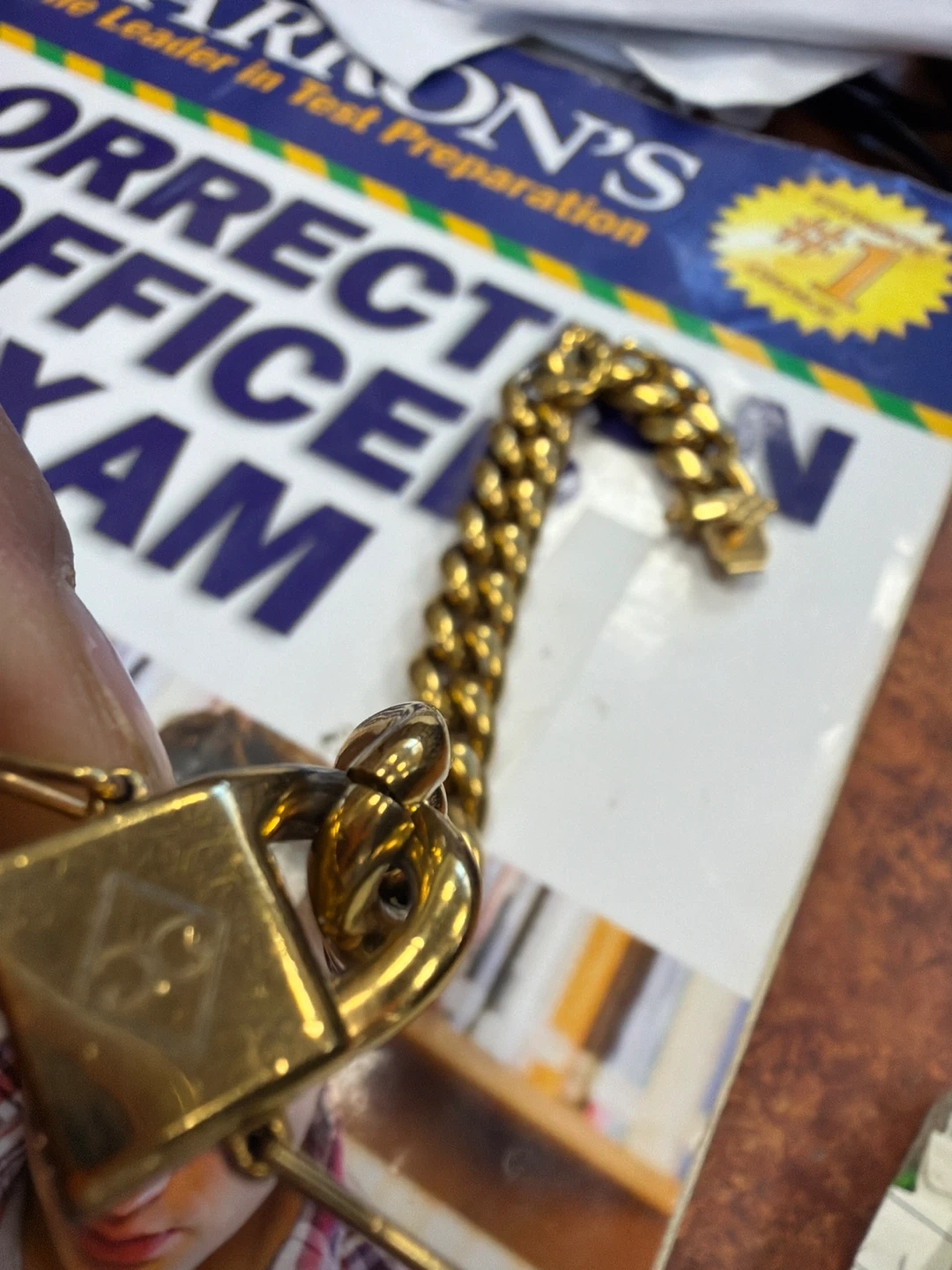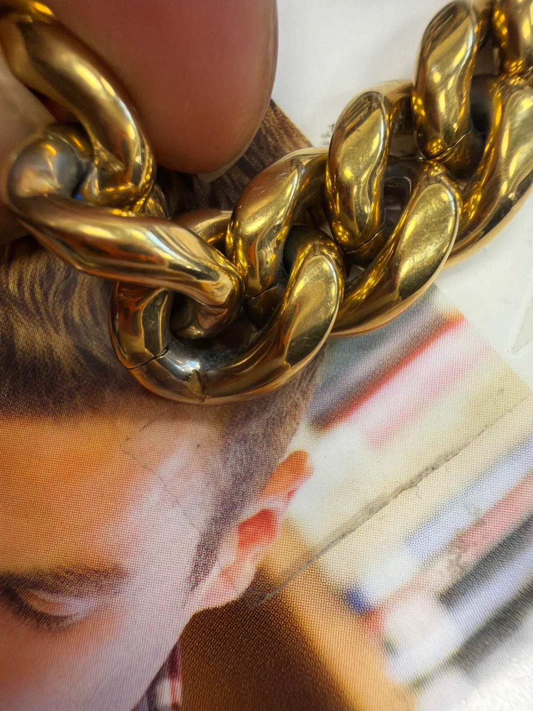 Chunky curb link bracelet with a gold tone finish. It features a secure box clasp closure. This bracelet adds a bold statement to any outfit! Iodine marks in between the links supposedly a foot baller paid $22,000 how much would you! Yes I know Chefs people & Taylor Swift maybe! ๐