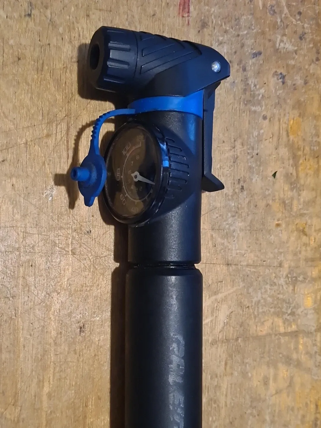 This is a Raleigh bicycle pump. It has an integrated pressure gauge. The pump is made of black and blue plastic and metal. It's useful for checking and maintaining tire pressure on your bike.
