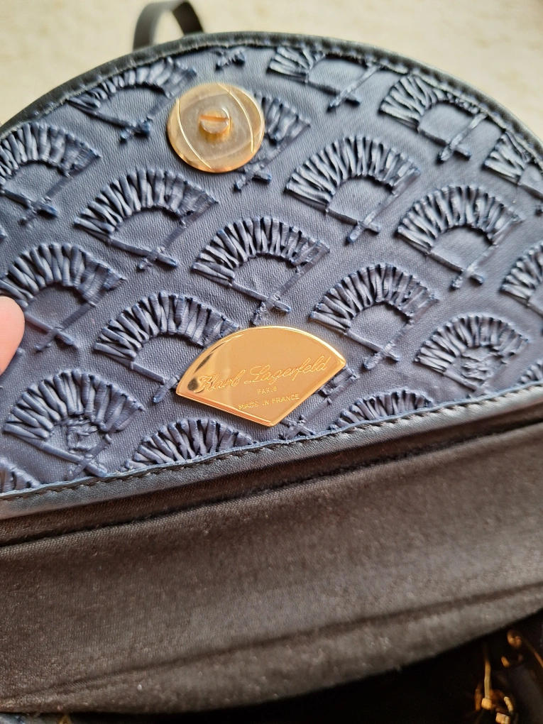Vintage Karl Lagerfeld signature embossed fan design with adjustable strap, can be worn crossbody or on shoulder. Excellent Condition Navy Blue, material is rubber. Made In France.