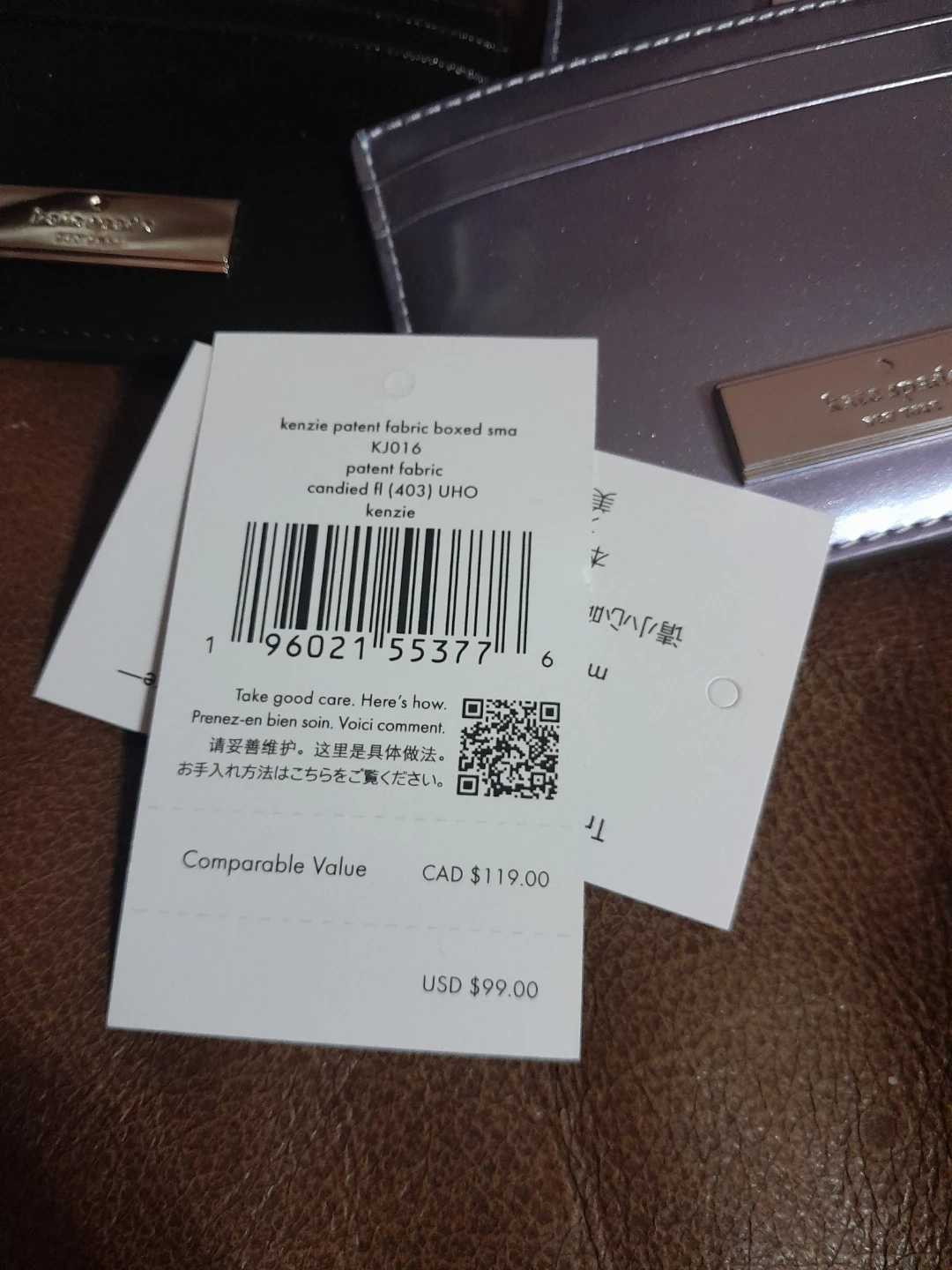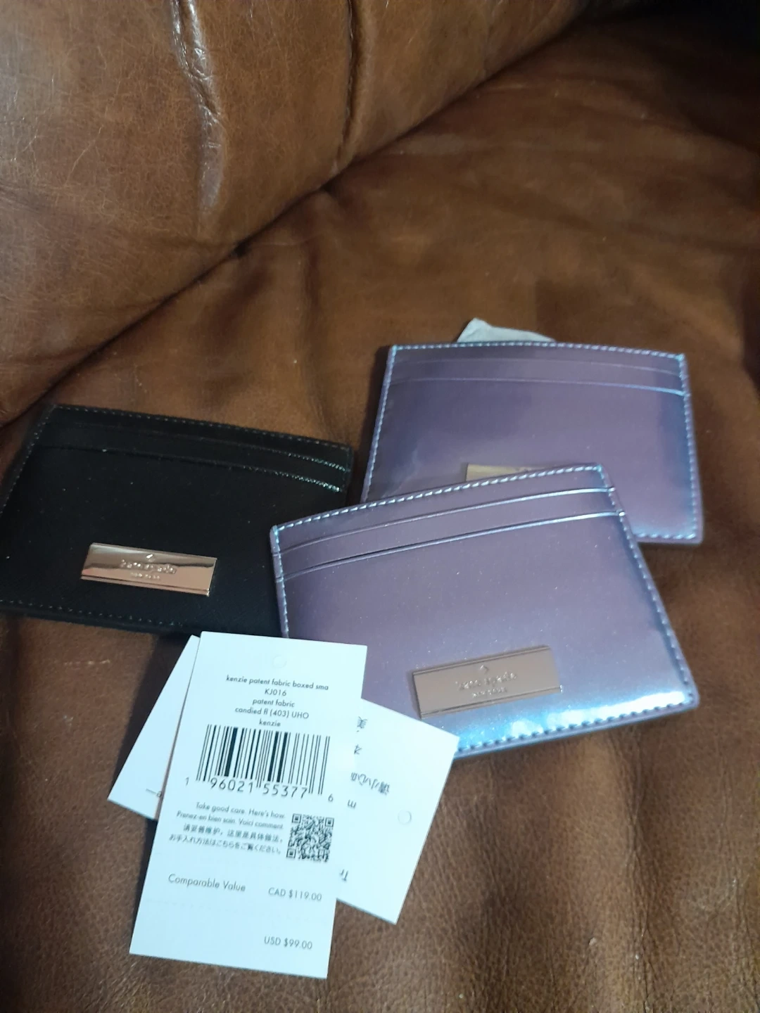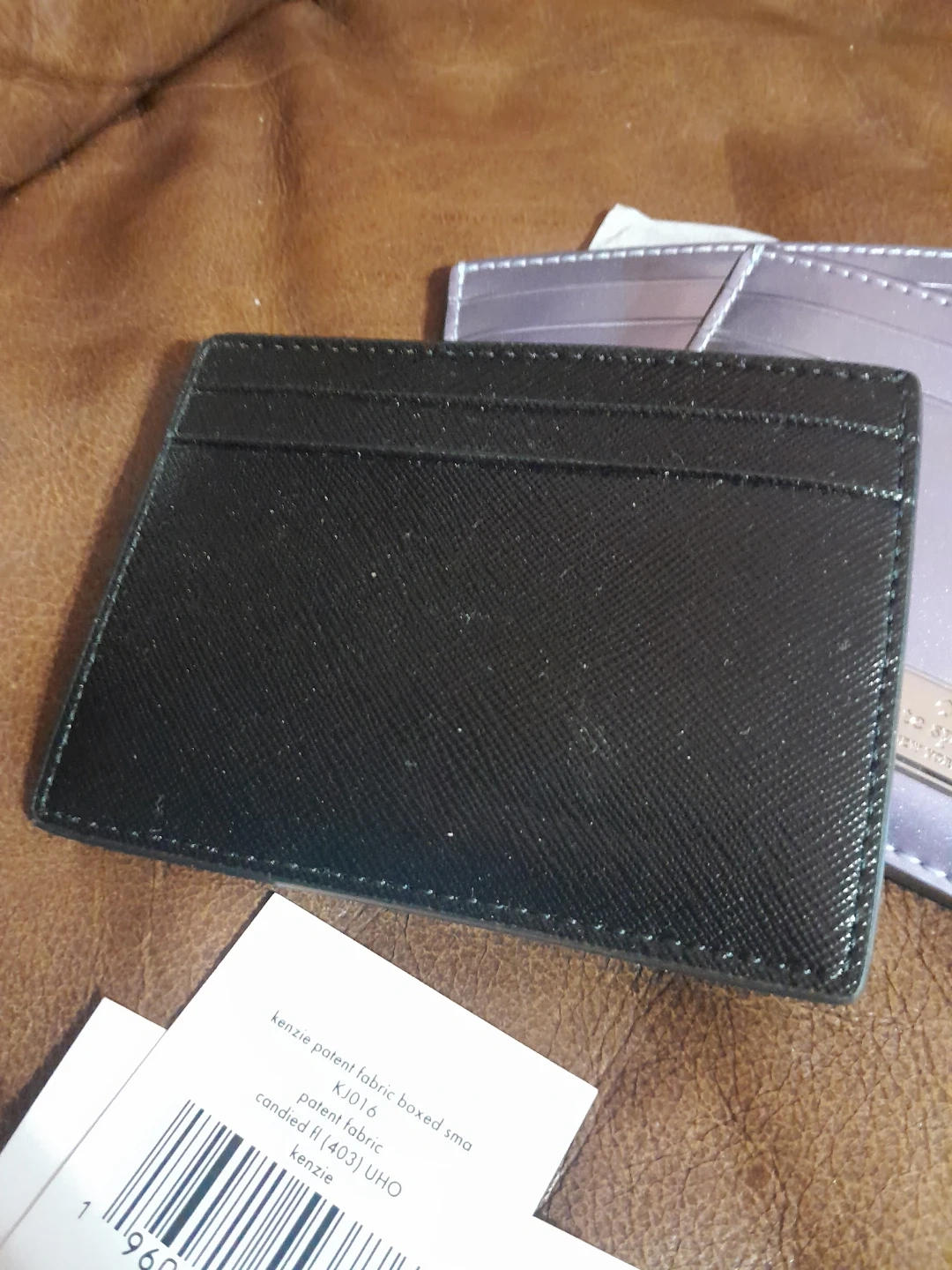 a black saffiano leather card holder and an iridescent card holder. Both are Kate Spade brand. Perfect for organizing your cards! They have 4 side card pockets, center pocket, retail for $99.00 brand new with tags your choice $15.00 each