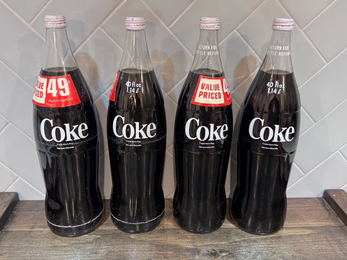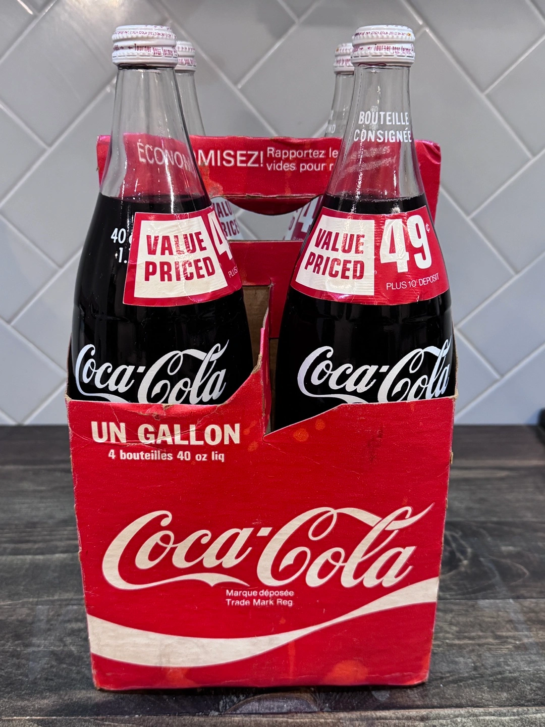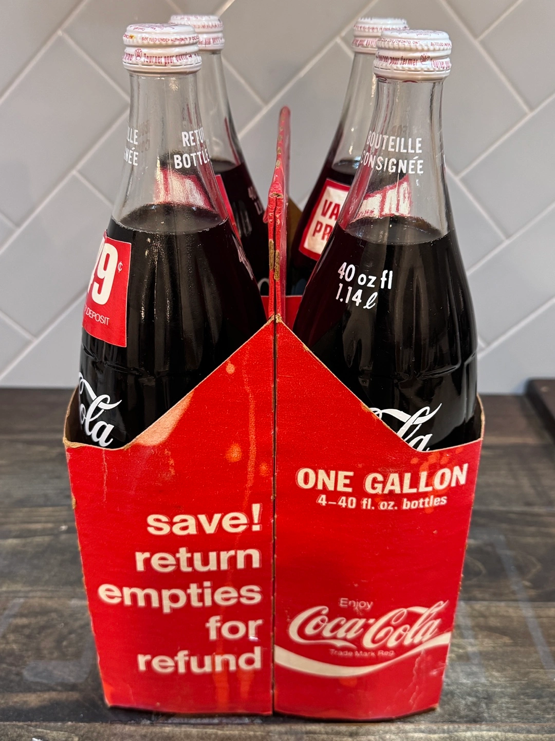 Vintage Coca-Cola 40 oz glass bottles in a 1 gallon cardboard carrier. The carrier is in fair condition, and the bottles are full.