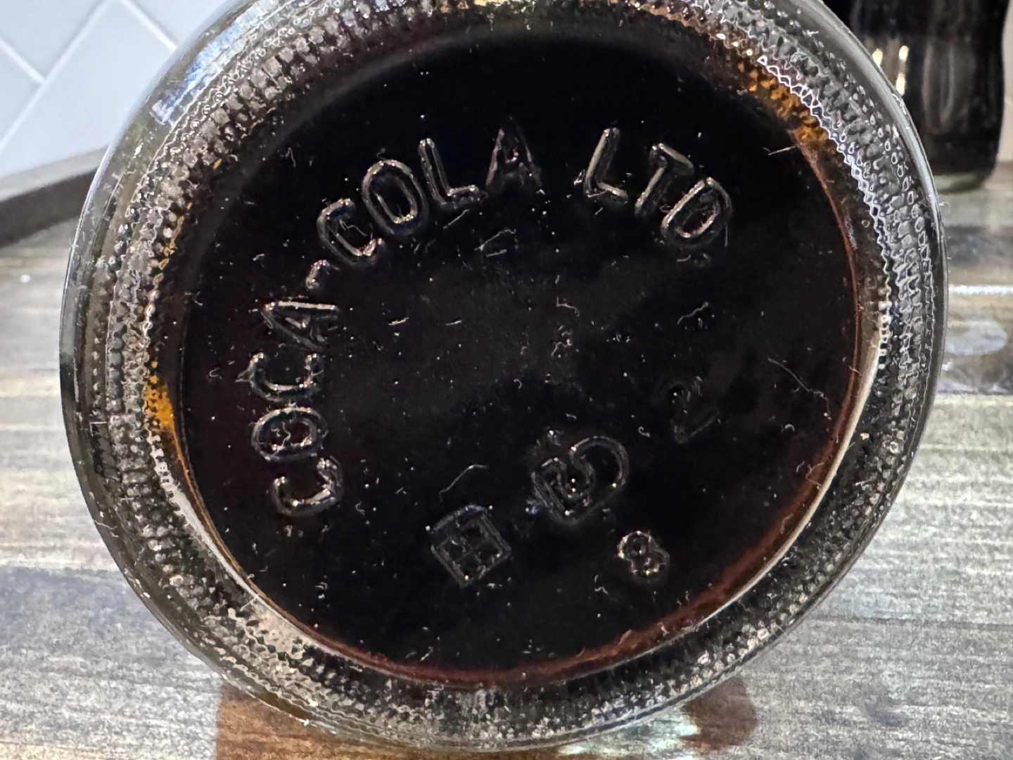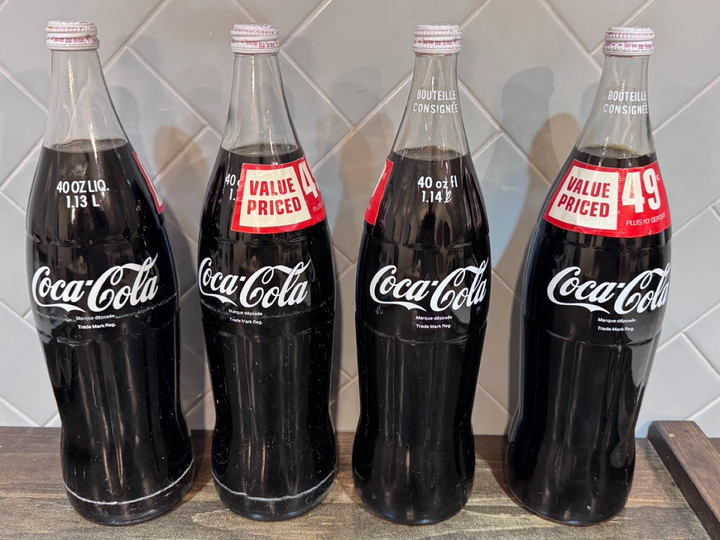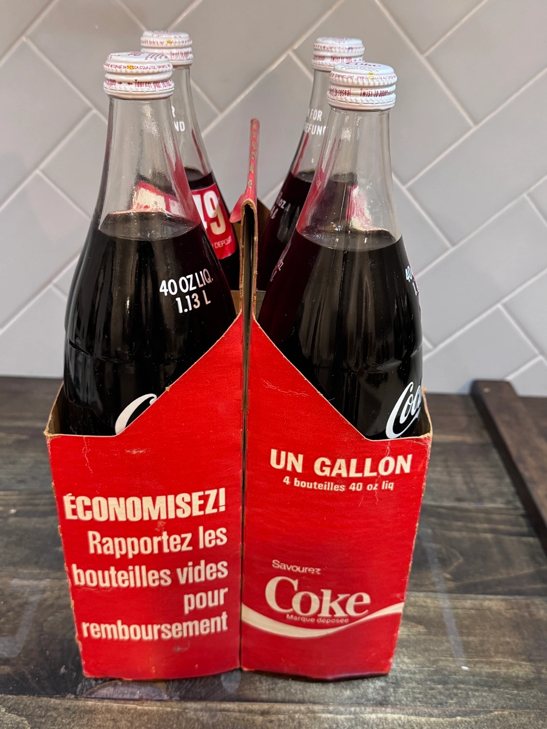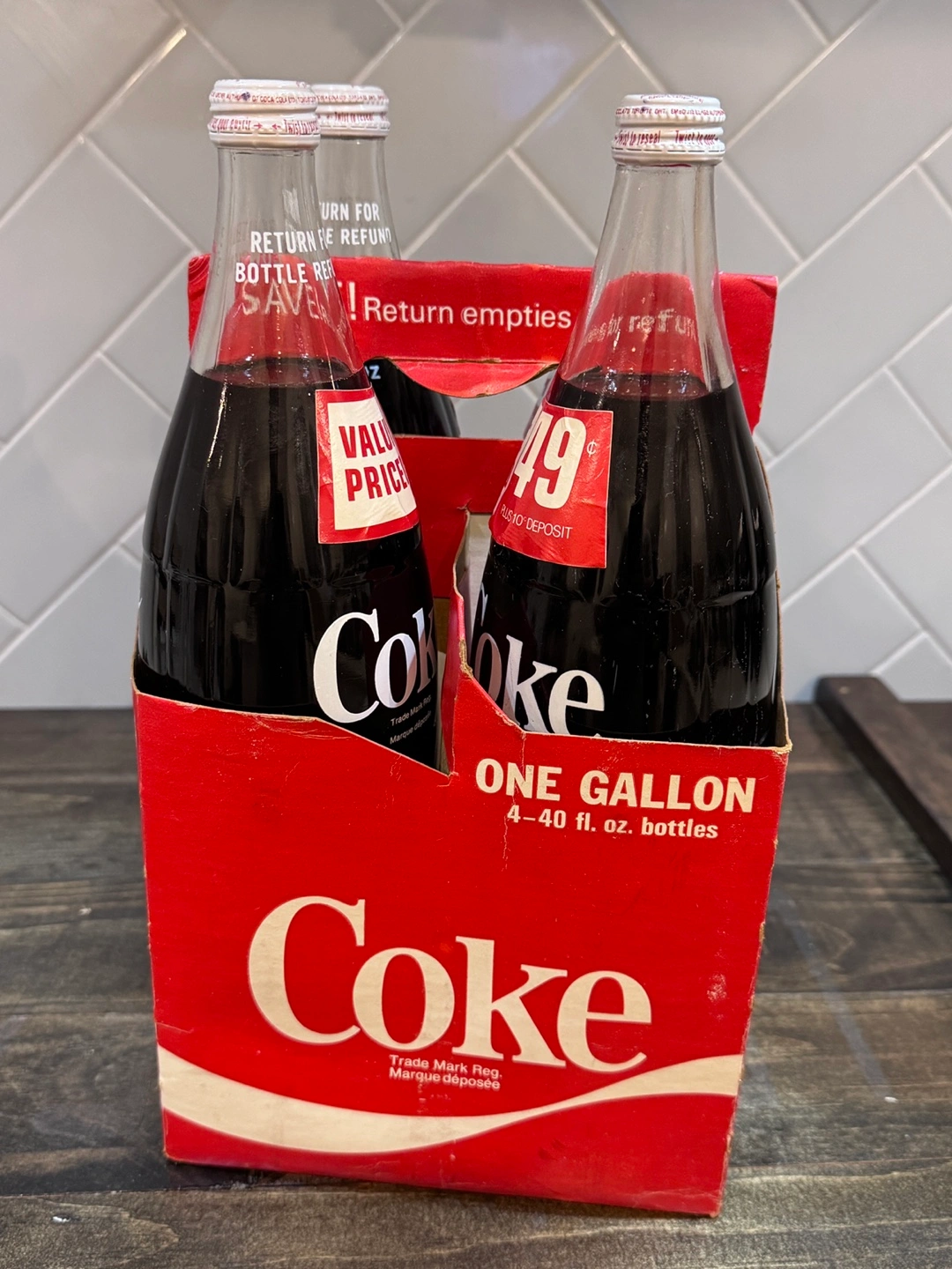 Vintage Coca-Cola 40 oz glass bottles in a 1 gallon cardboard carrier. The carrier is in fair condition, and the bottles are full.