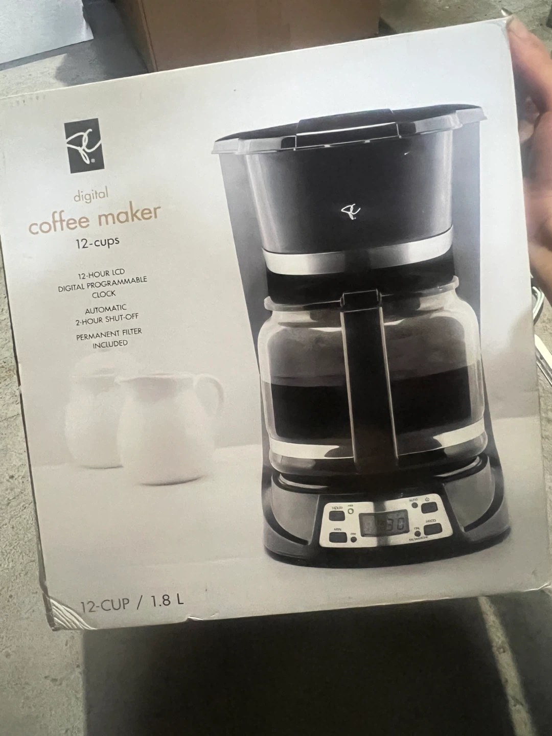 Selling a digital coffee maker that can brew up to 12 cups! It features a 12-hour LCD digital programmable clock and an automatic 2-hour shut-off function for safety. A permanent filter is also included