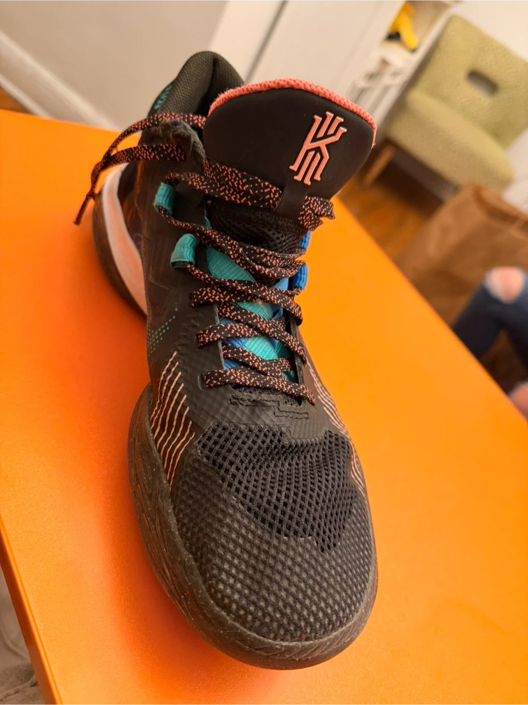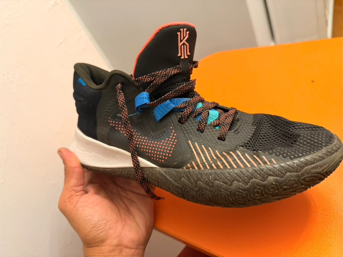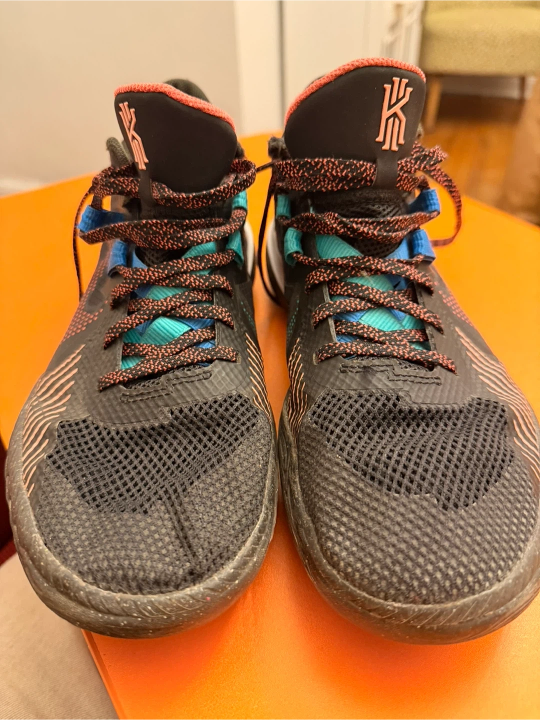 Nike Kyrie Flytrap IV basketball shoes in black and multi-color. Features a mesh upper and a distinctive patterned sole. Lightweight design for performance.