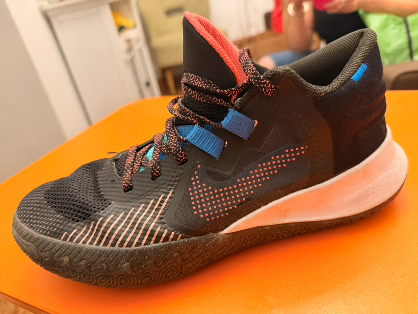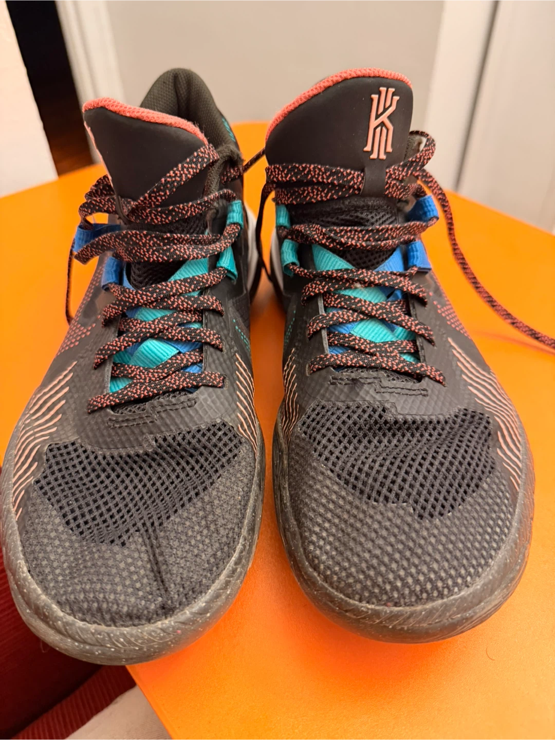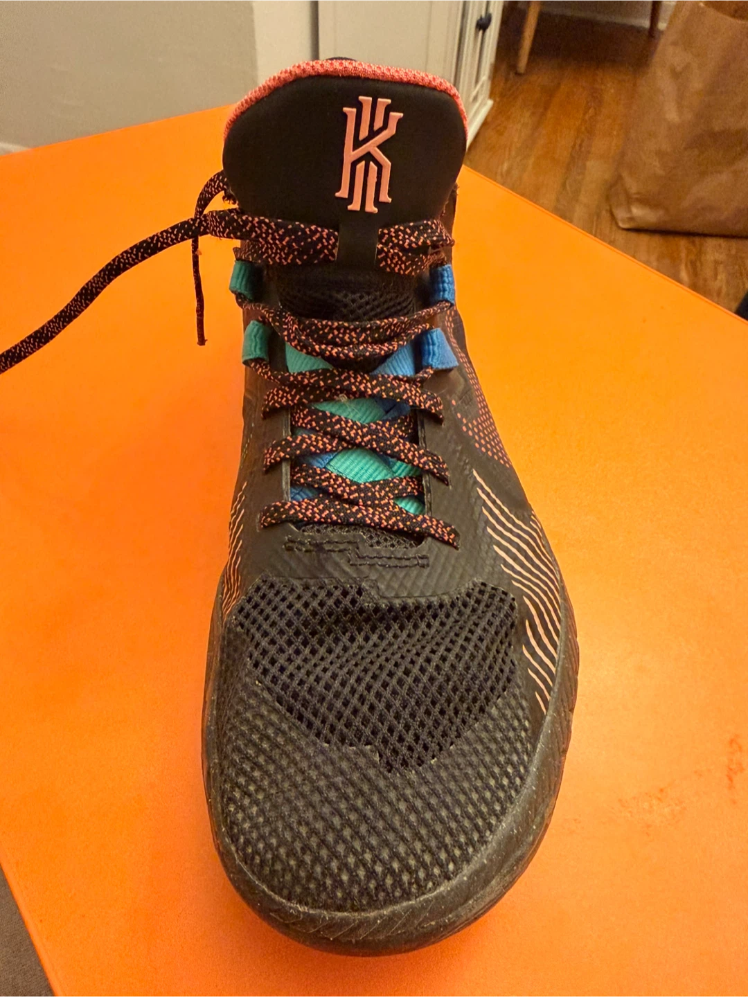 Nike Kyrie Flytrap IV basketball shoes in black and multi-color. Features a mesh upper and a distinctive patterned sole. Lightweight design for performance.