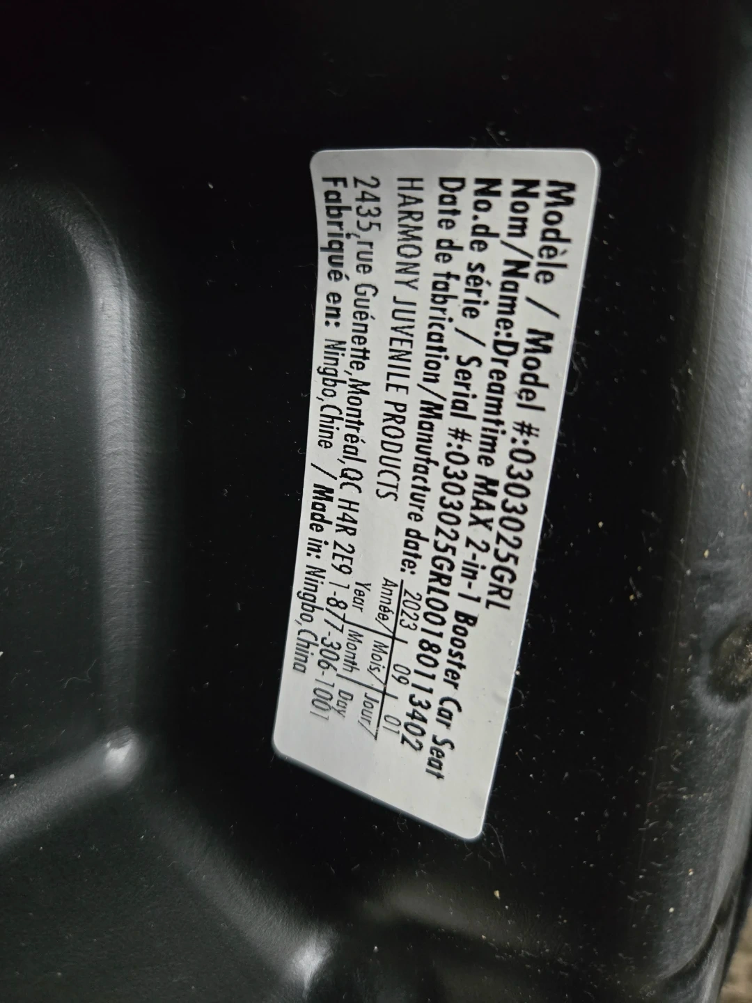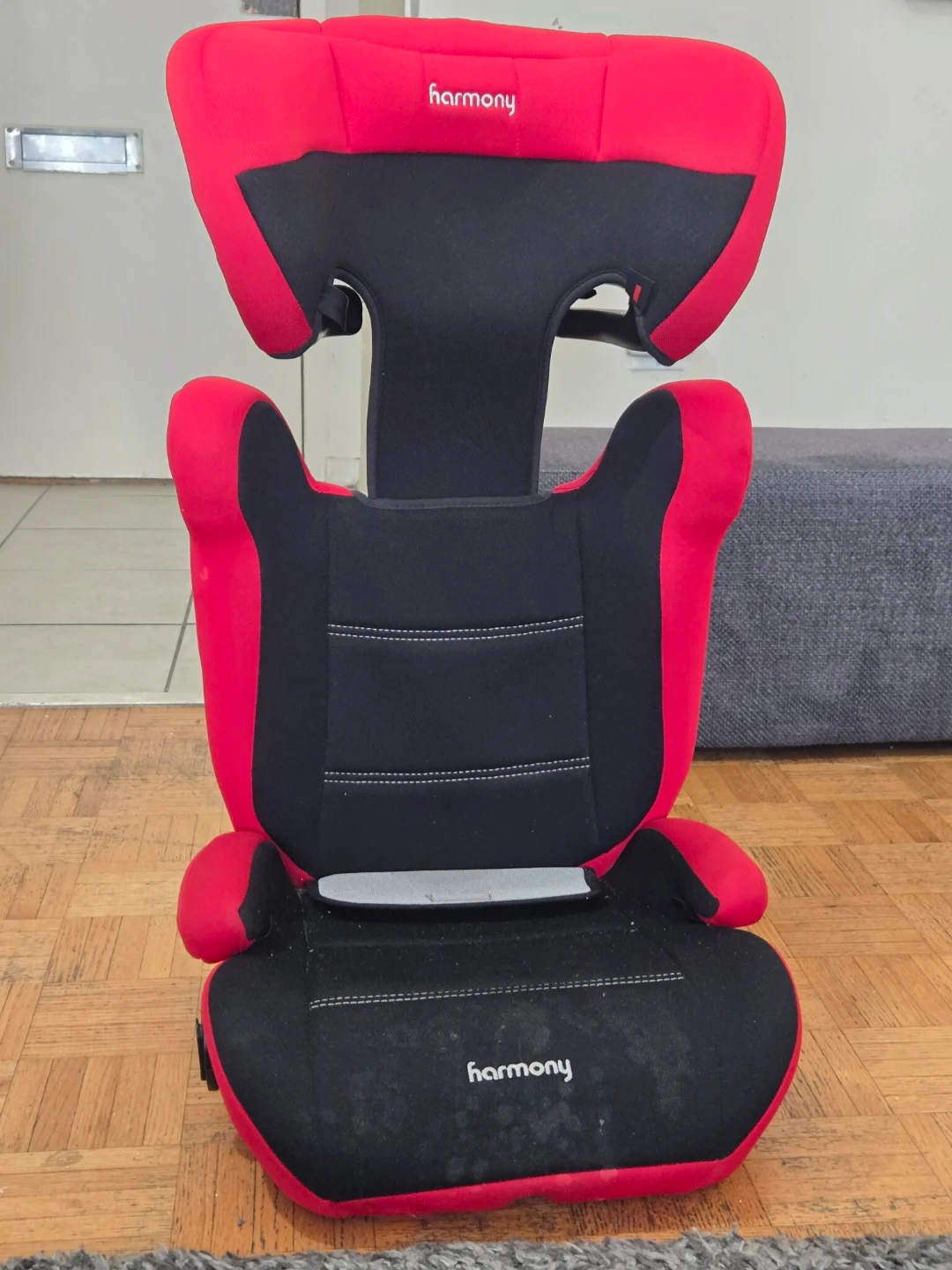 Harmony Dreamtime MAX 2-in-1 booster car seat in red and black. Manufactured in 2020. This booster seat is designed for children transitioning from a harness to a seat belt.