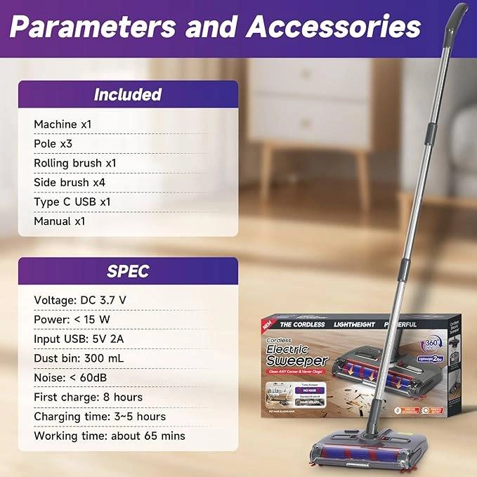 Description: Swivel Cordless Sweeper,Floor Cordless Sweeper, Cordless Electric Sweeper Rechargeable Cordless Sweeper, 360 Direction, Hard Floor Sweeper Roller Sweeper for Home Crumbs, Kitchen, pet Hair