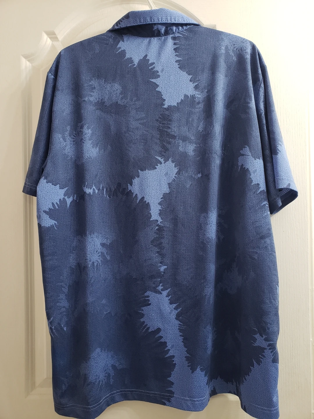 Adidas golf polo shirt in blue with a tie-dye inspired pattern. Made in Thailand. It's a size XL or TG.