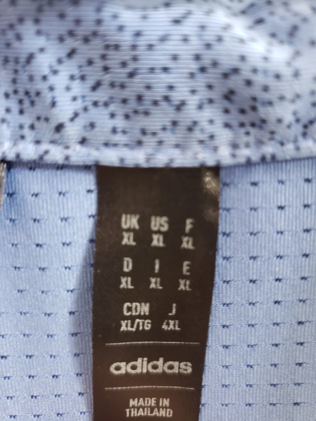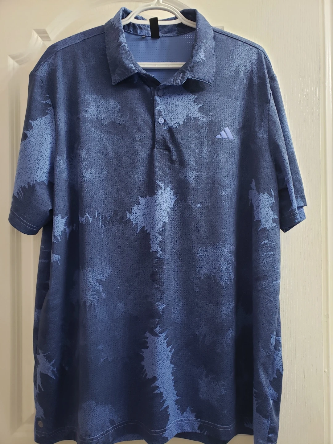 Adidas golf polo shirt in blue with a tie-dye inspired pattern. Made in Thailand. It's a size XL or TG.