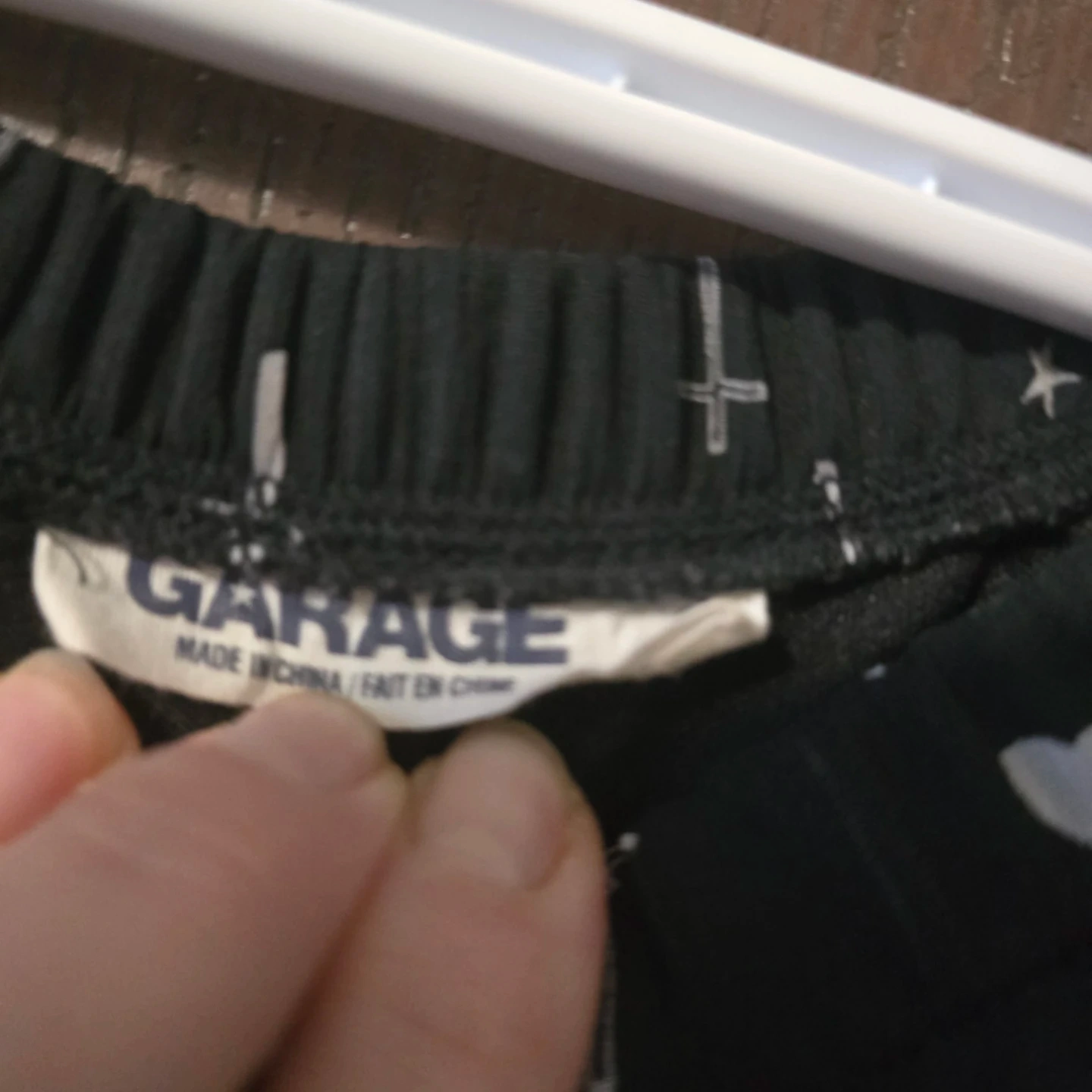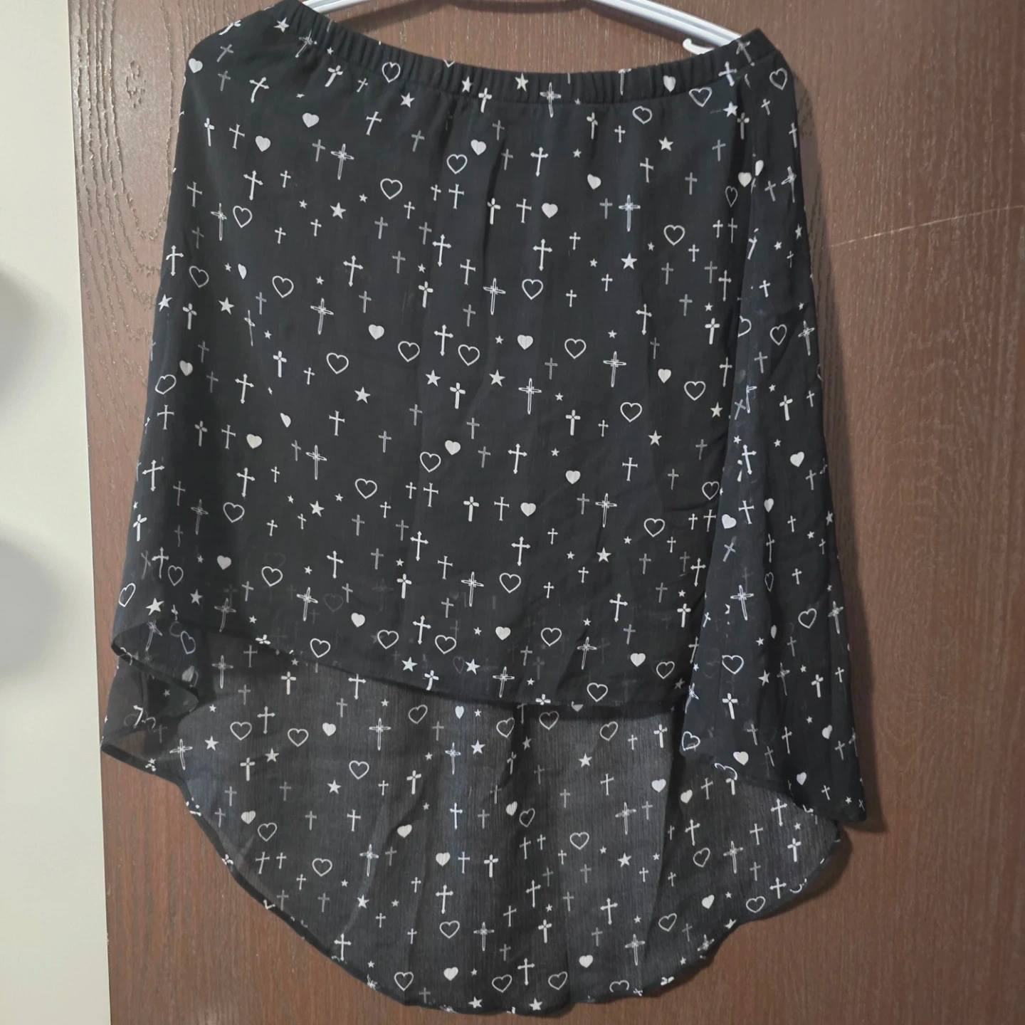 This Garage skirt features a black base with a white all-over print of crosses, hearts, and stars. It has a high-low hemline and a comfortable elastic waistband. Lightweight material for easy wear.