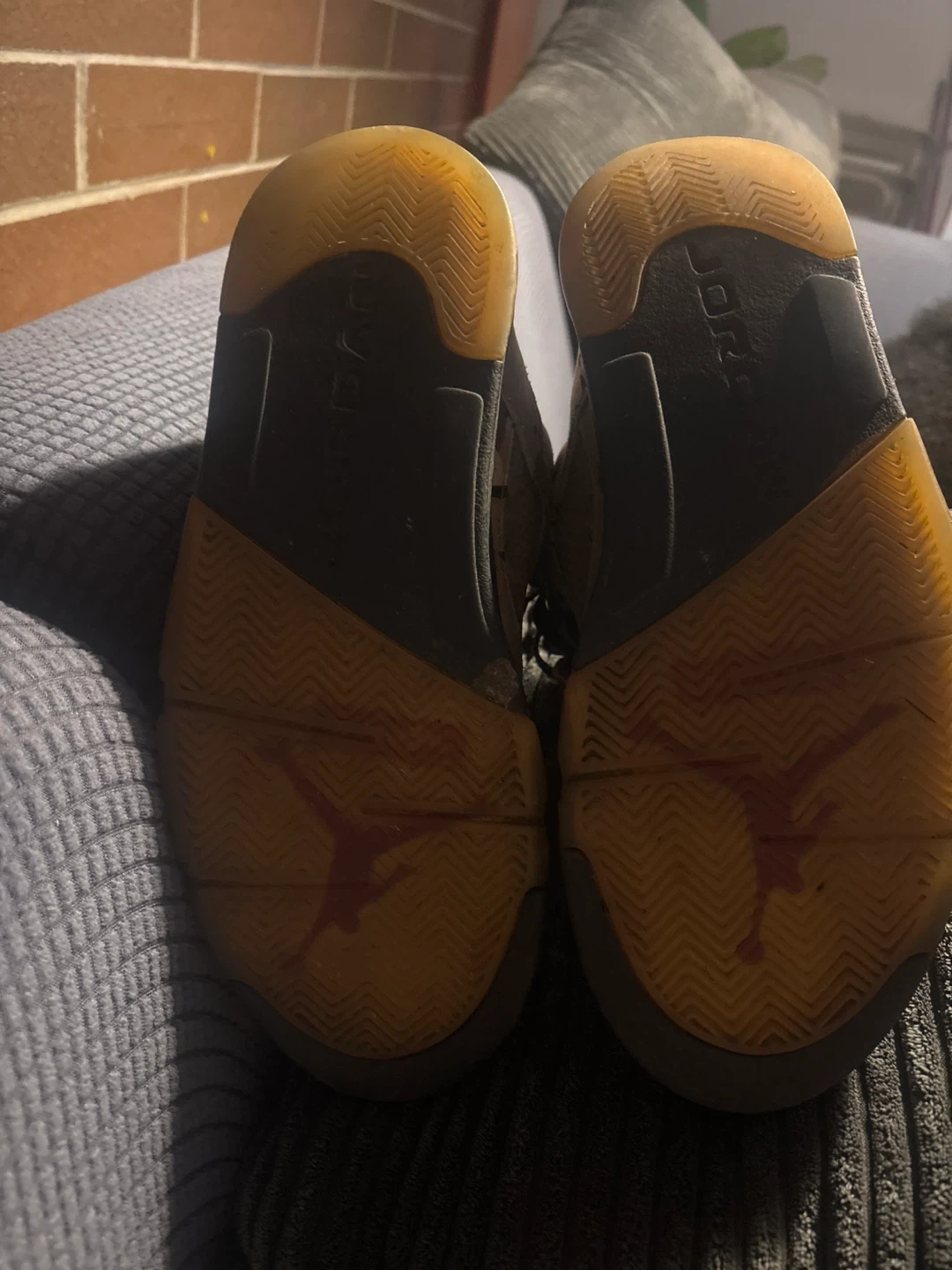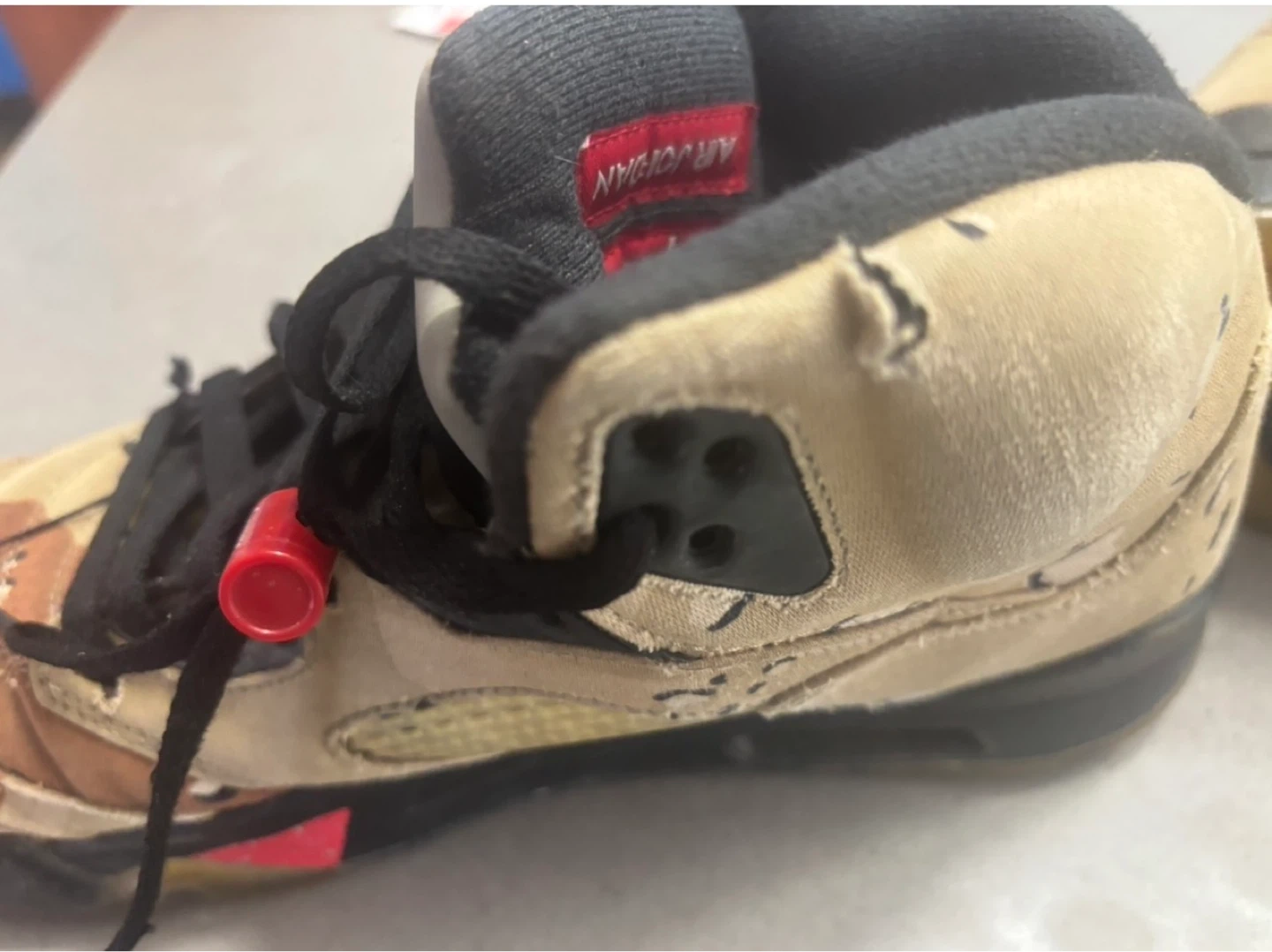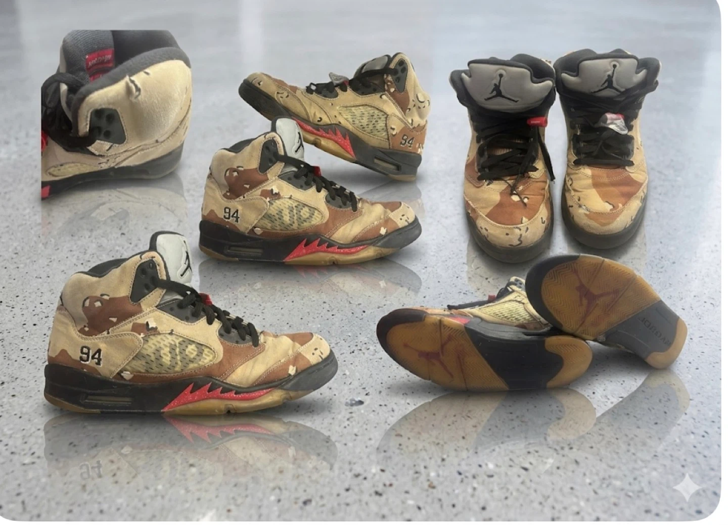 These Air Jordan 5s have a cool Supreme camo pattern and the number 94 on the heel. They're a mid-top style with black laces and soles. Great for sneaker collectors!