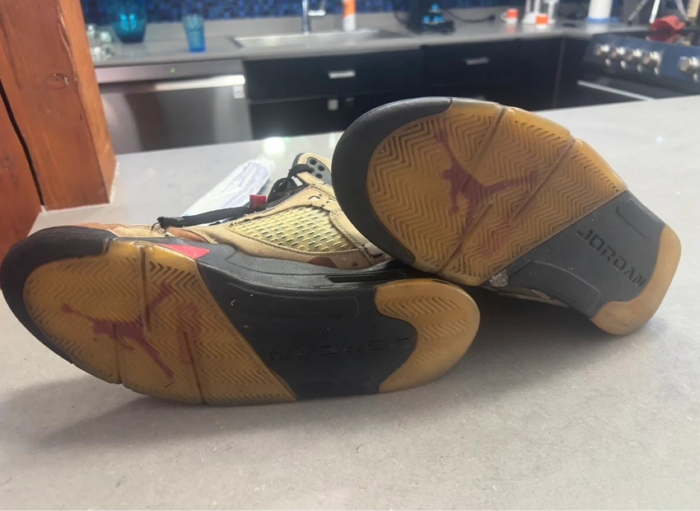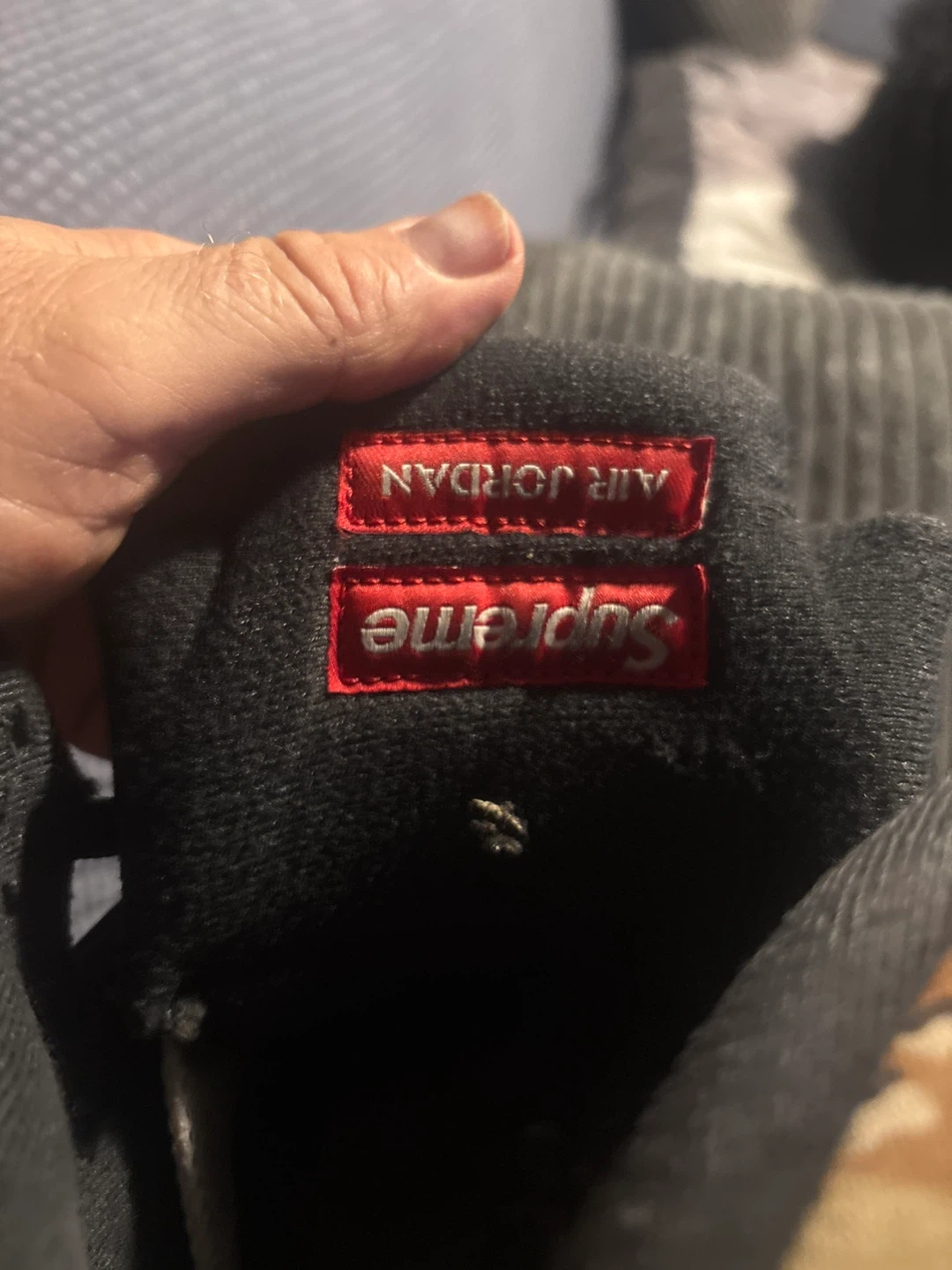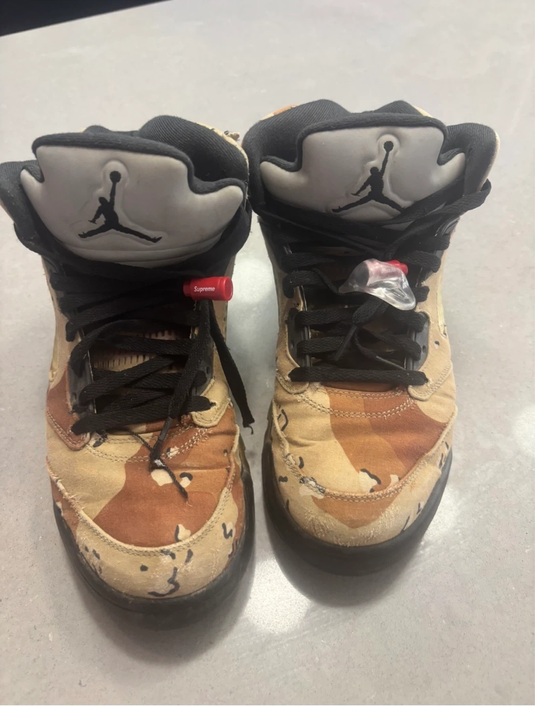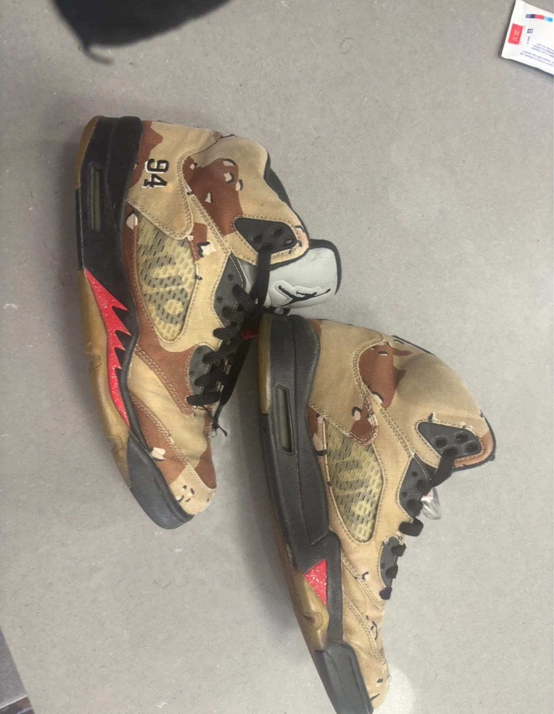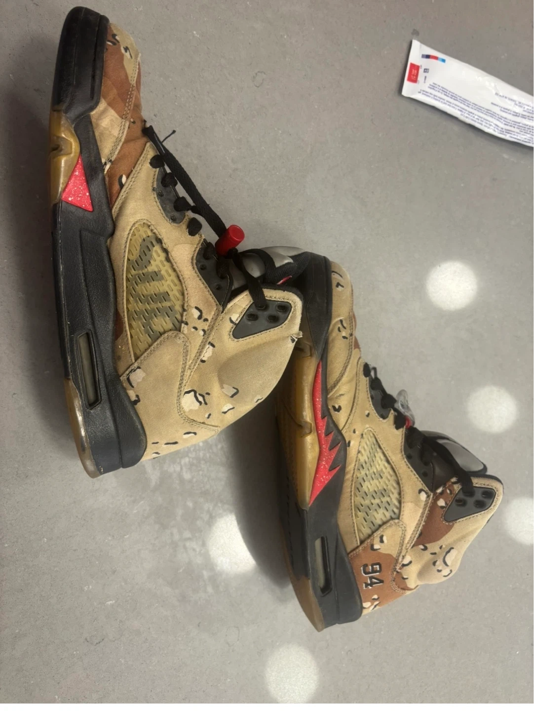 These Air Jordan 5s have a cool Supreme camo pattern and the number 94 on the heel. They're a mid-top style with black laces and soles. Great for sneaker collectors!