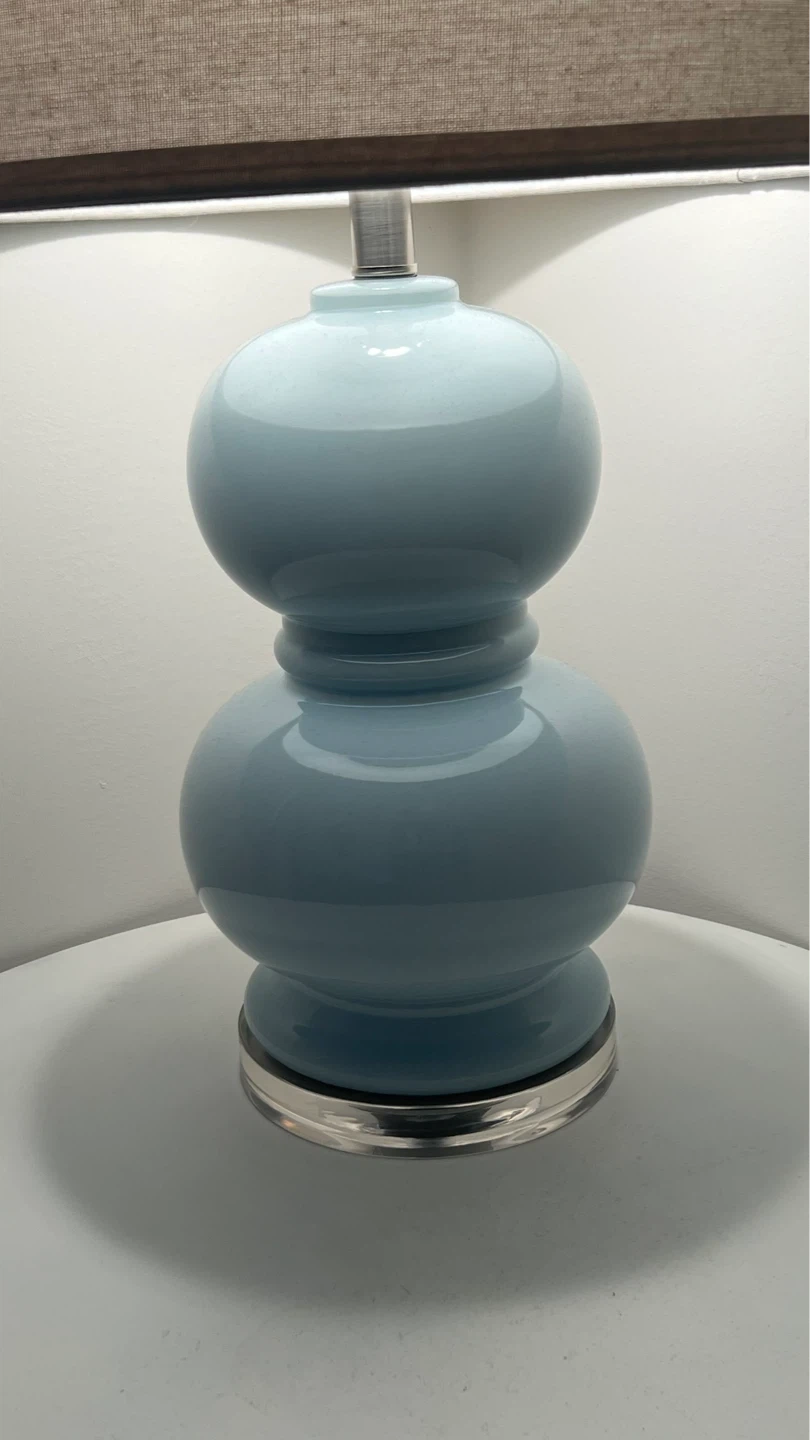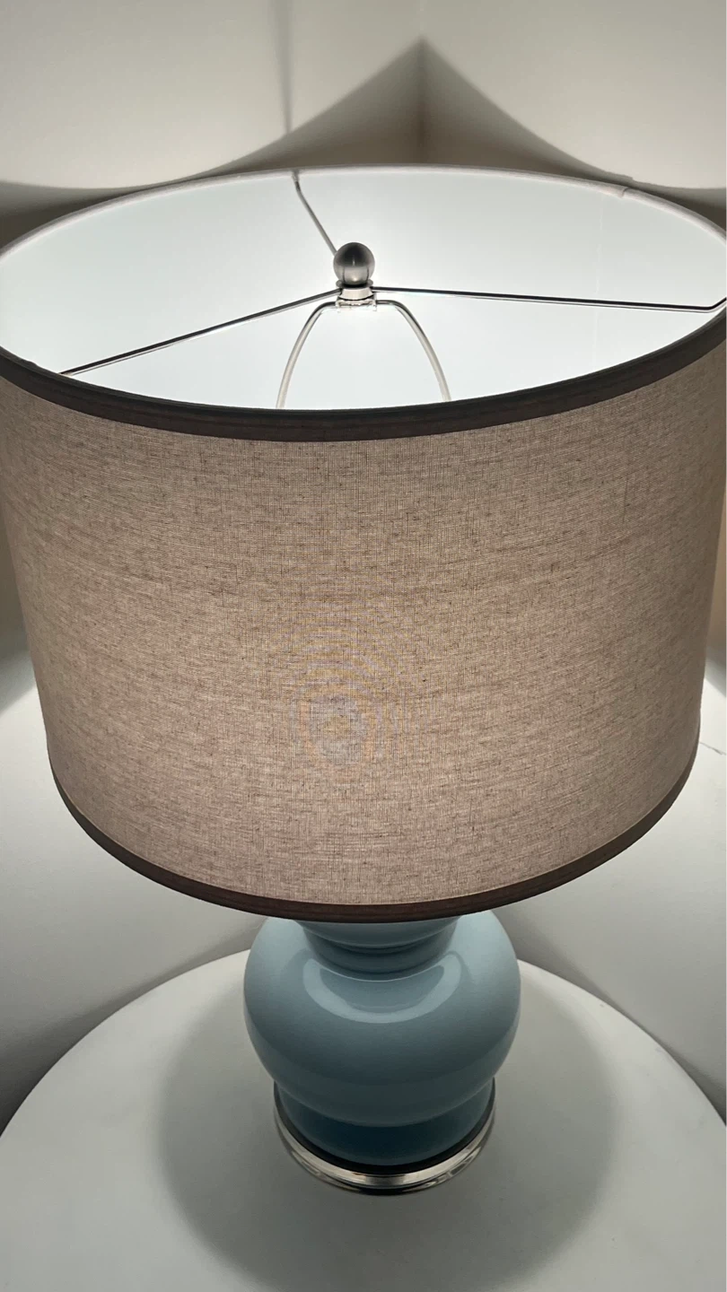 This is a light blue ceramic table lamp with a stacked, globe-shaped base. It features a tan linen-look drum shade. The metallic silver base accent adds a touch of elegance. It's a nice accent lamp for a side table or nightstand!