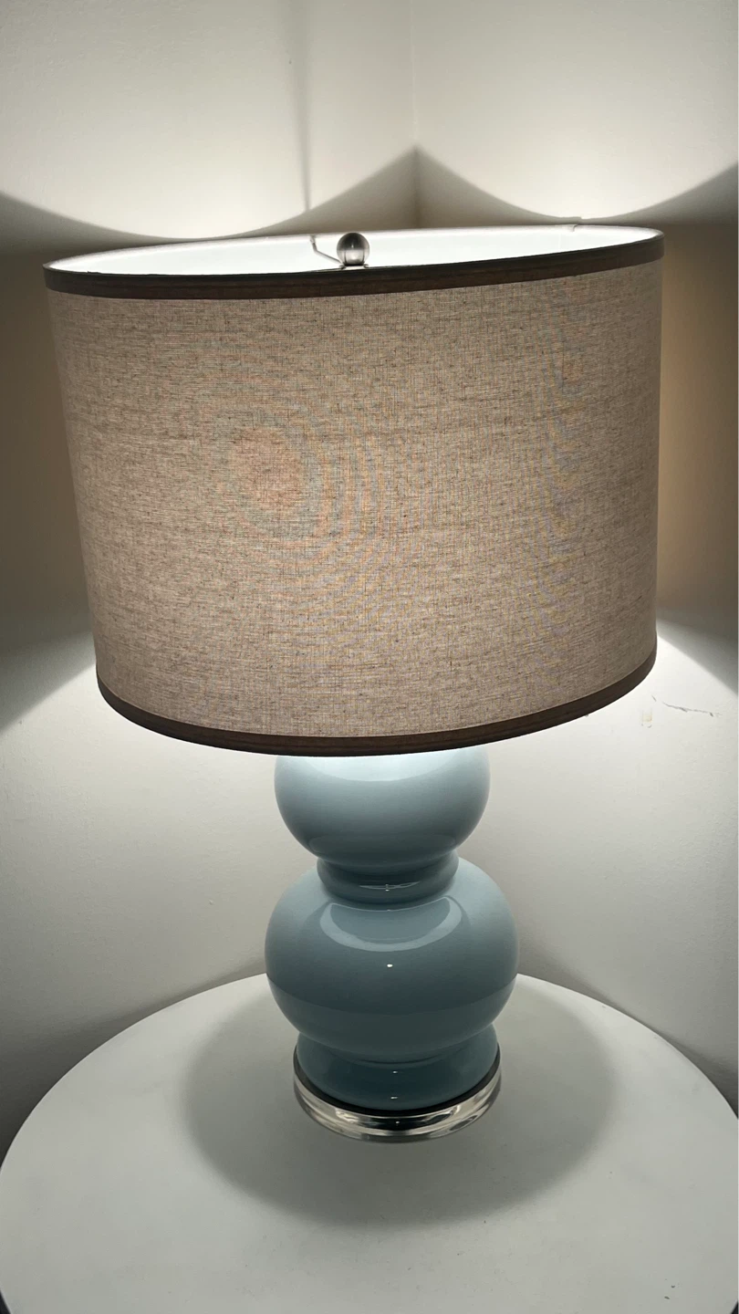 This is a light blue ceramic table lamp with a stacked, globe-shaped base. It features a tan linen-look drum shade. The metallic silver base accent adds a touch of elegance. It's a nice accent lamp for a side table or nightstand!